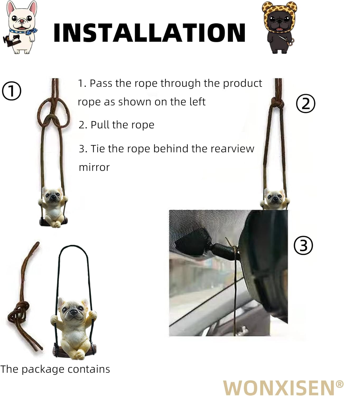 4. Easy to install. Just pass the rope around the rear-view mirror and adjust the length of the rope according to your preference.