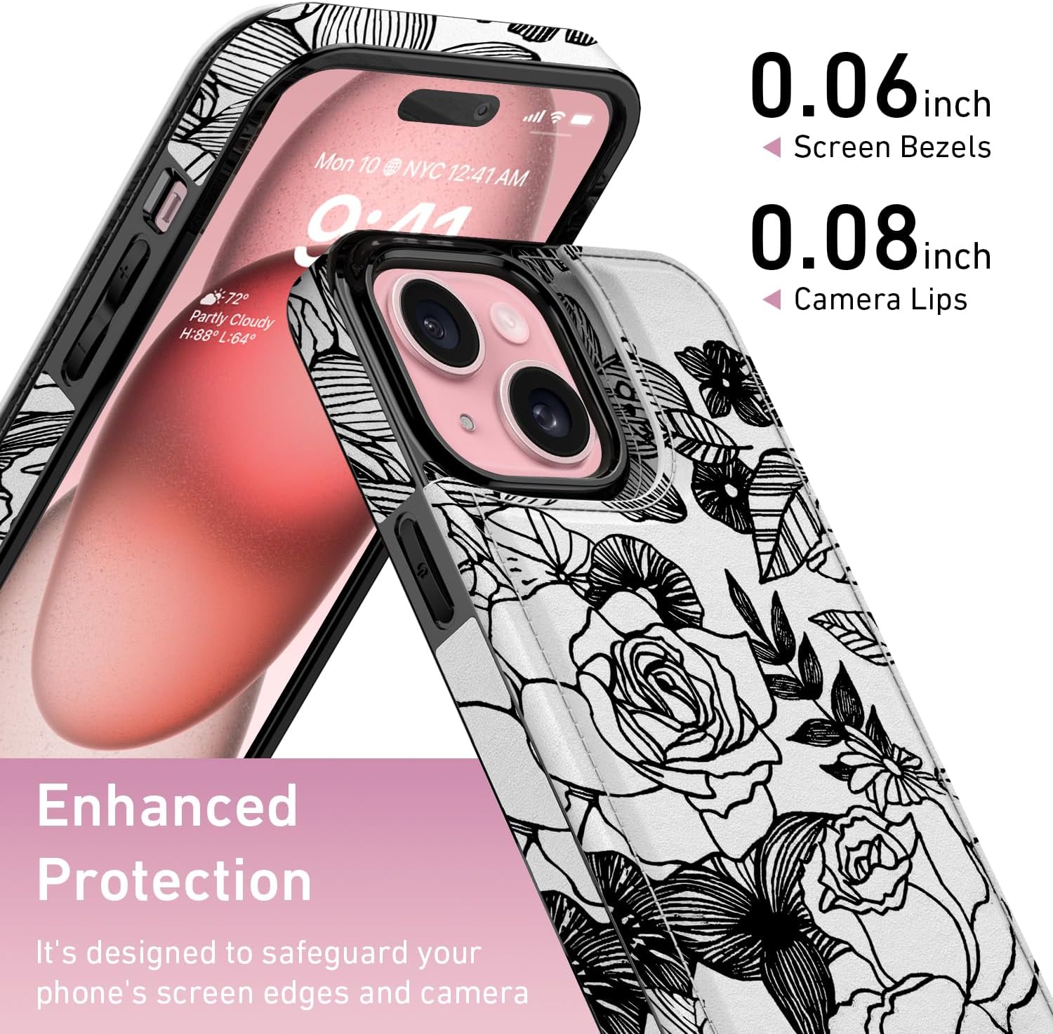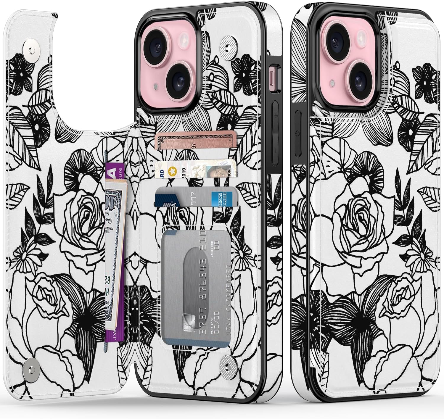 FUNMIKO for iPhone 15 Plus Wallet Case with Card Holder + Cash Clip, RFID-Blocking, Military-Grade Drop Protection & UV-Printed Artwork, Magnetic Closure with Leather Kickstand – Floral Sketch