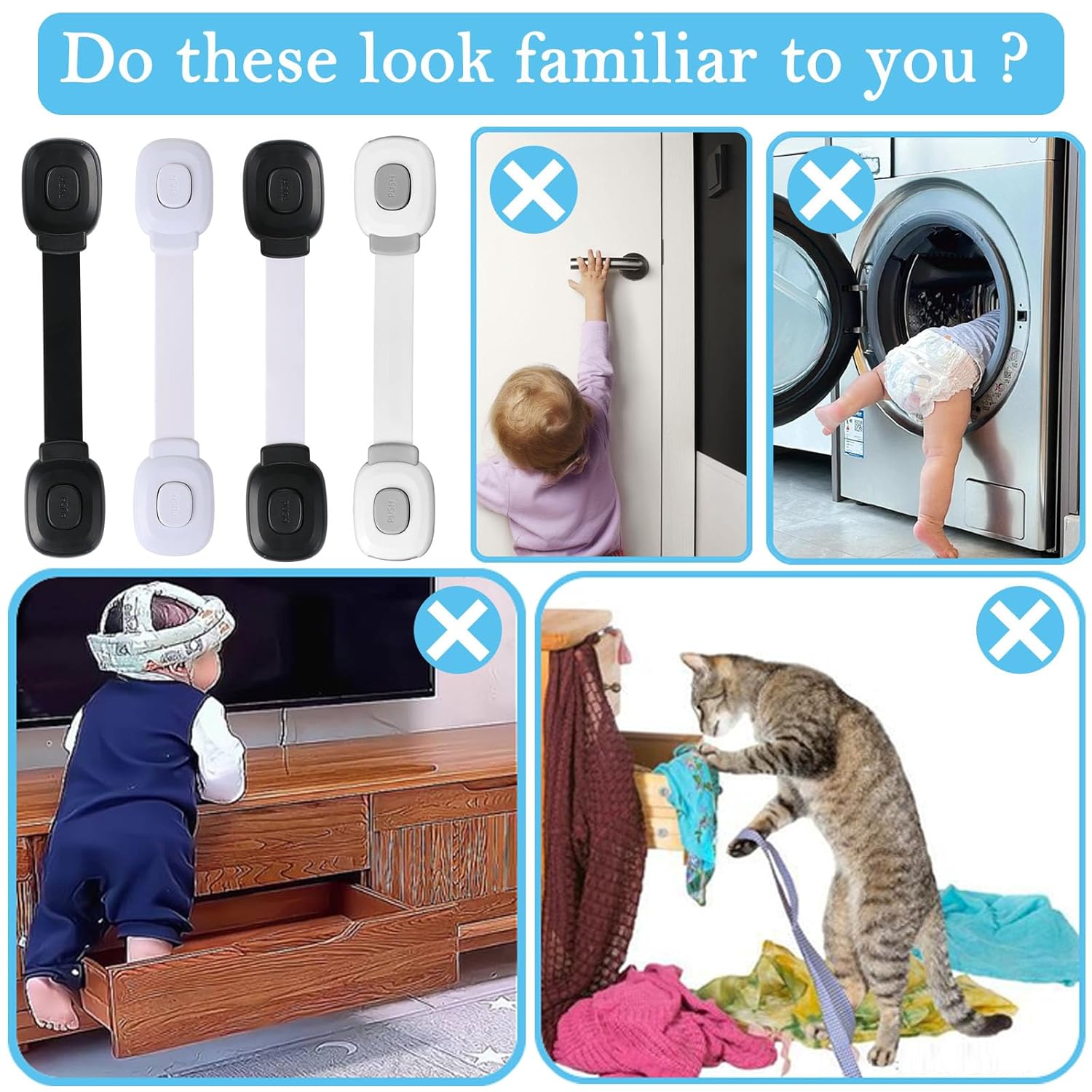 Easy to Install Baby Safety Cabinet Locks: Strong adhesive industrial-grade tape on both sides of the child safety cabinet lock, No drilling screw or any special tools needed! so you can install and remove them within seconds, causing no damage, mar or remaining any marks on your furniture. and child safety strap locks are easy to use for adults but nearly impossible for a child to figure out – even if they can, they lack the finger strength to depress the buttons easily