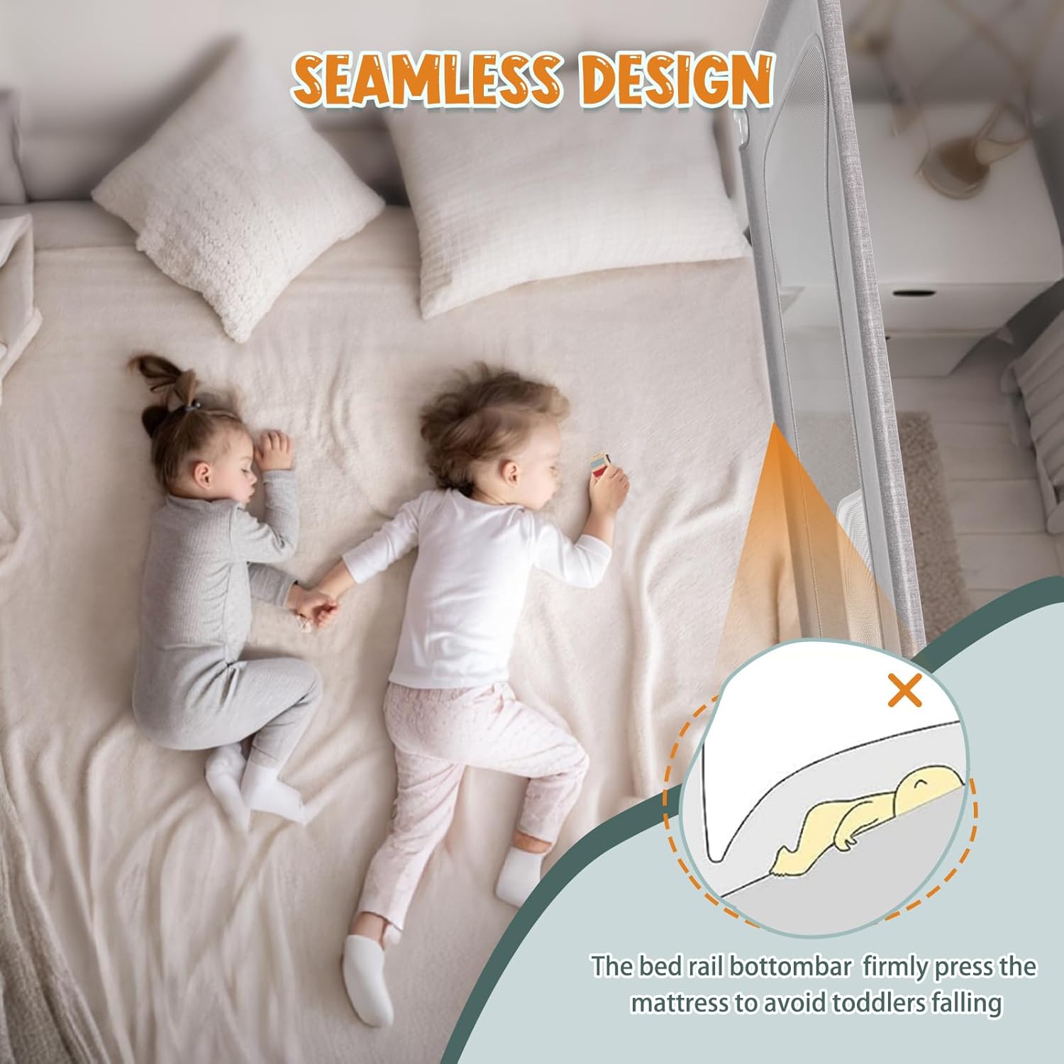 To ensure a seamless and stable experience, our safe bed rail features a bottom bar that securely presses the mattress, leaving no gap between the guardrail and the bed.