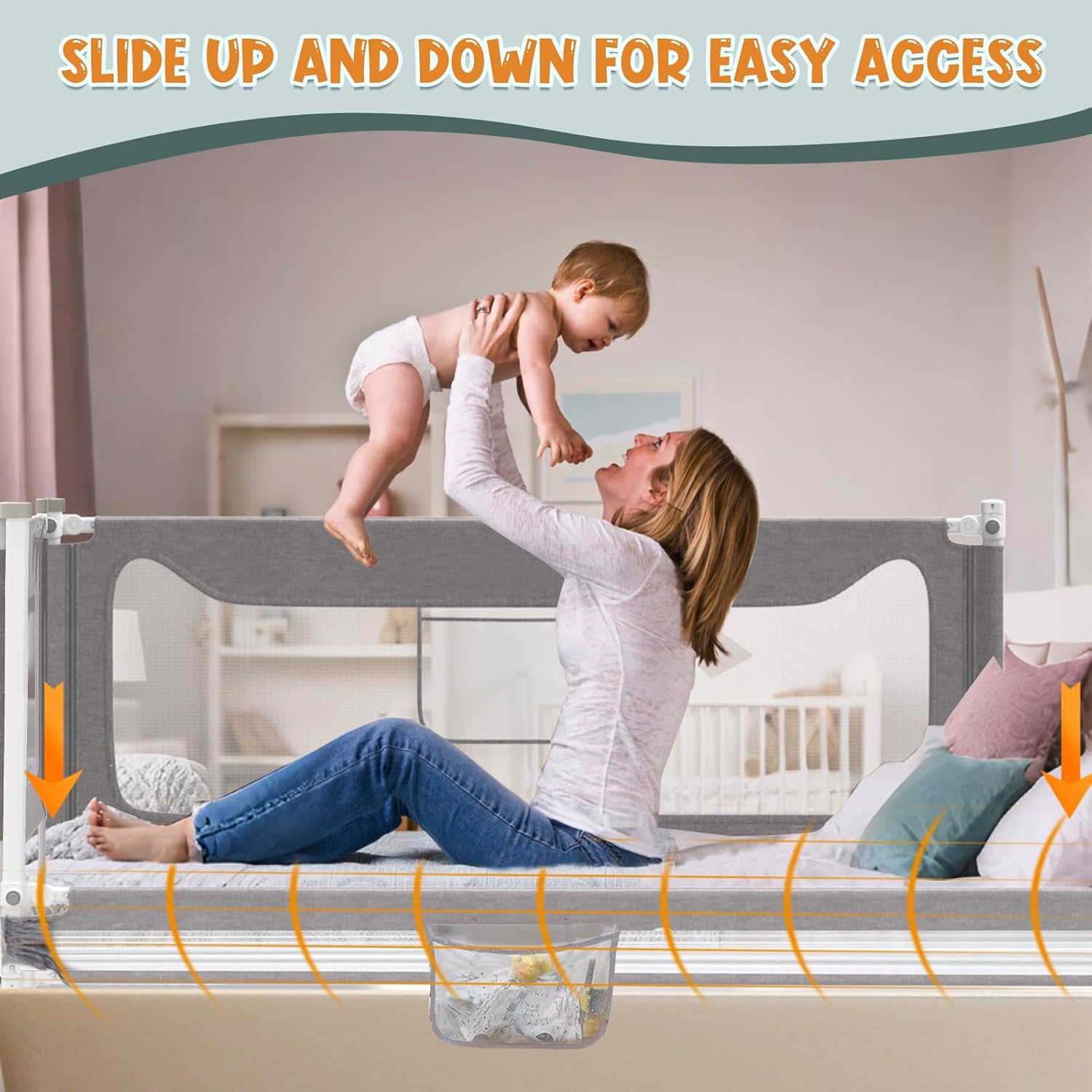 The toddler bed rail is equipped with a double-sided child safety lock, ensuring that babies cannot accidentally operate it. With the ability to independently lift each side and a single-hand lock button, parents can effortlessly and smoothly get in and out of bed without any inconveniences or sticking