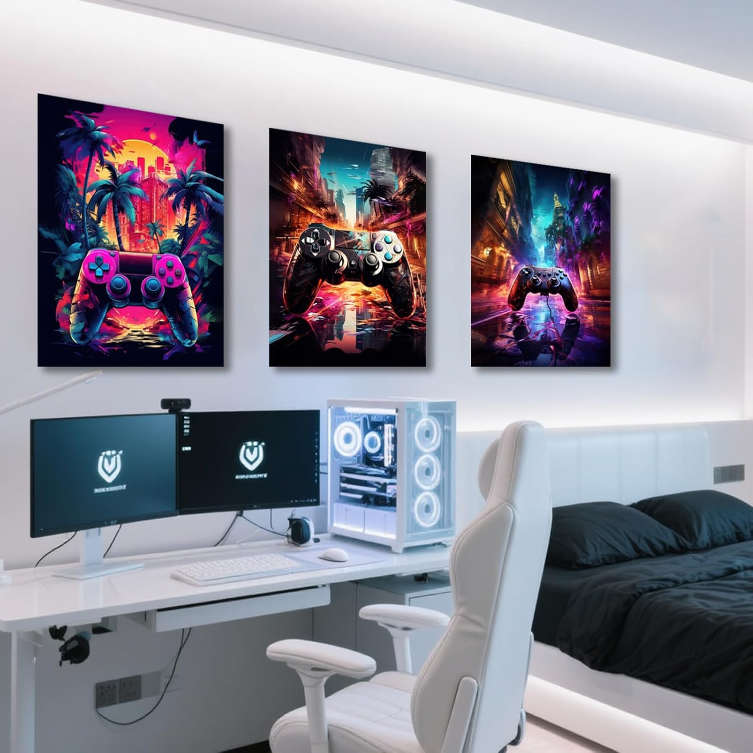 Gaming Wall Art Set of 3Game Controller Poster Prints Cool Gamer Room Decor for Boys Video Game Wall Art Cyberpunk Painting Wall Picture for Bedroom or Esports Room Unframed 16×24 Inch