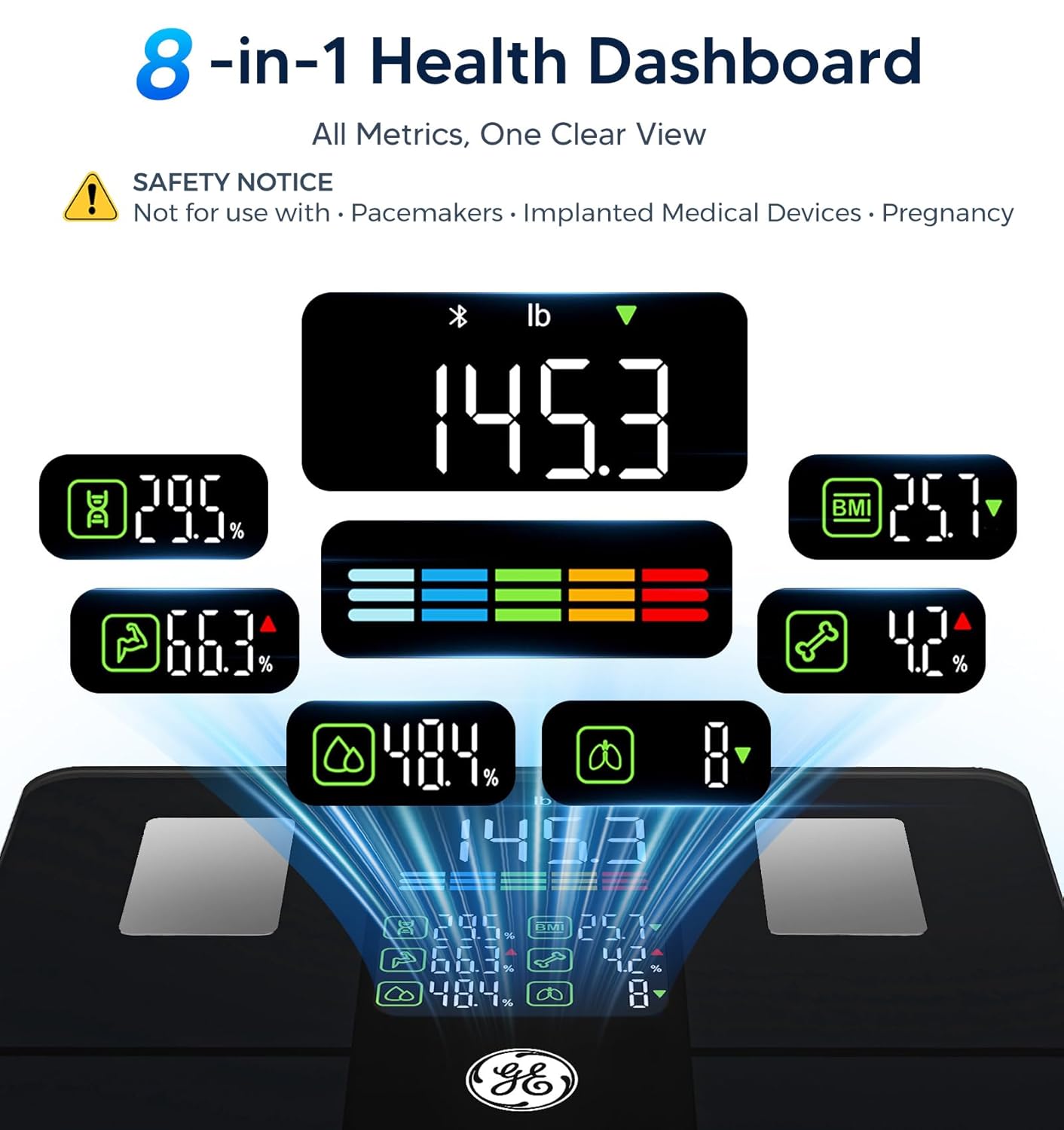 14 Key Body Metrics & Health Analysis: This GE body fat scale measures 14 essential health indicators including weight, body type, body fat, BMI, skeletal muscle, muscle mass, protein, BMR, fat-free body weight, subcutaneous fat, visceral fat, body water, bone mass and metabolic age. The data empowers you to create personalized fitness plans based on precise body composition insights