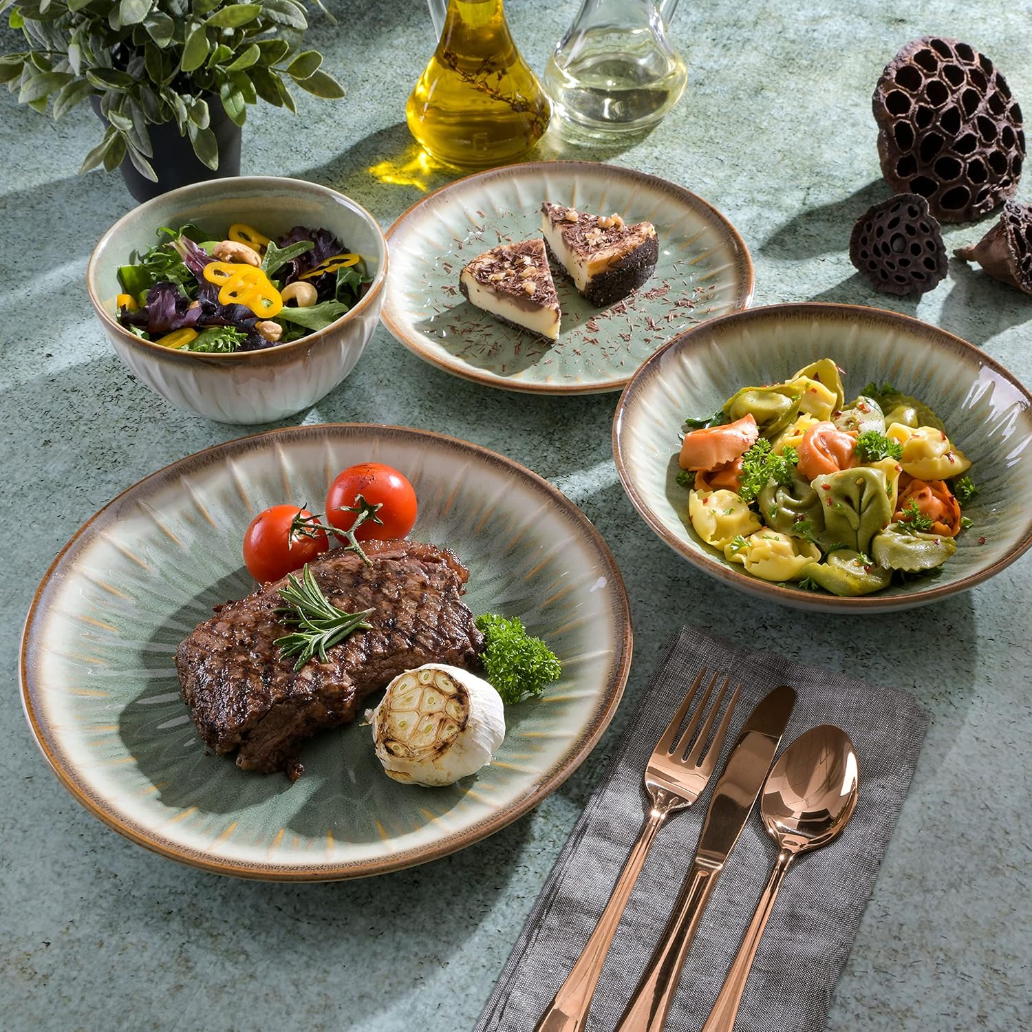 Gibson Elite Mayfair Bay 16-Piece Embossed Double Bowl Dinnerware Set, Service for 4 – Green Stoneware Plates and Bowls