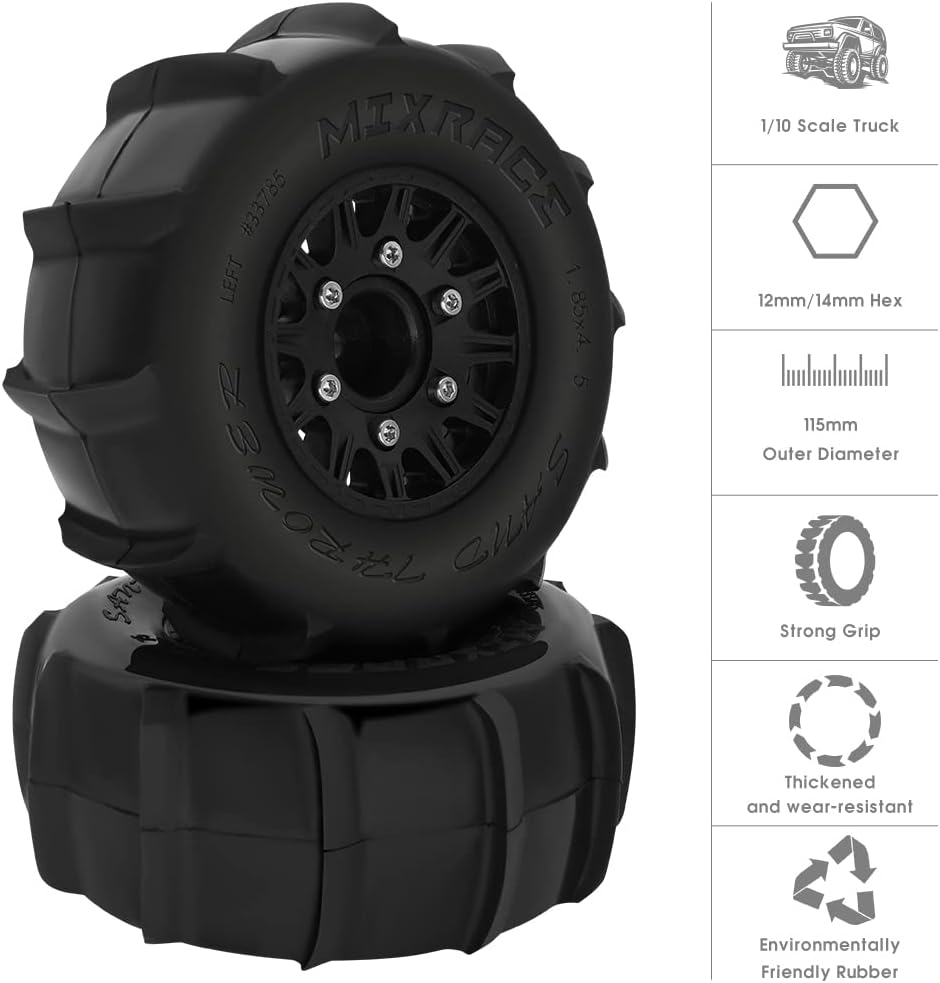 ✔️【Compatibility】This 1/10 scale RC wheels and tires, it designed for almost all 1/10 scale RC trucks with 12mm hex 14mm hex, like for 1/10 slash Arrma Senton Axial Redcat Rc4wd RC monster truck Buggy, etc 1/10 universal Truck tires.