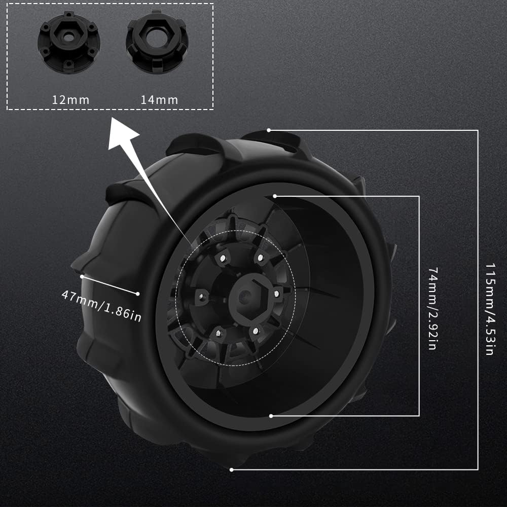 ✔️【RC Truck Wheels and Tires Size】The size of our 1/10 12mm/14mm hex RC tires, Outer Diameter: 4.52″(115mm) | inner diameter: 2.91″(74mm) | Width: 1.86″ (47mm) | Hex Size: 12mm/14mm. Please make sure our 1/10 RC wheels and tires are the correct sizes you are looking for, to avoid the returns products and save your time due to the not compatible size, set comes with 12mm and 14mm Hex Can be disassembled and replaced.