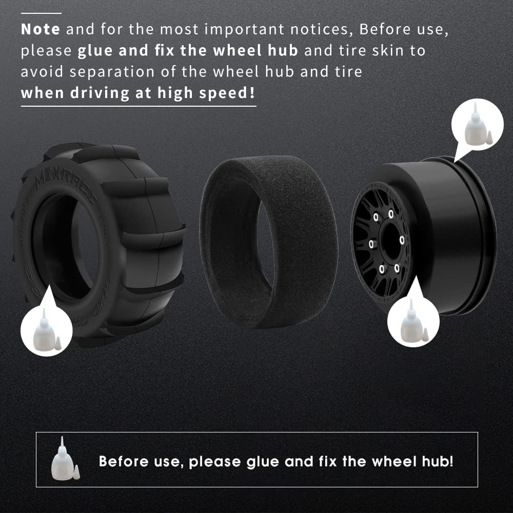 ✔️【Tips】Note: The important notice, Before use, please glue and fix the wheel hub and tire skin to avoid separation of the wheel hub and tire when driving at high speed!