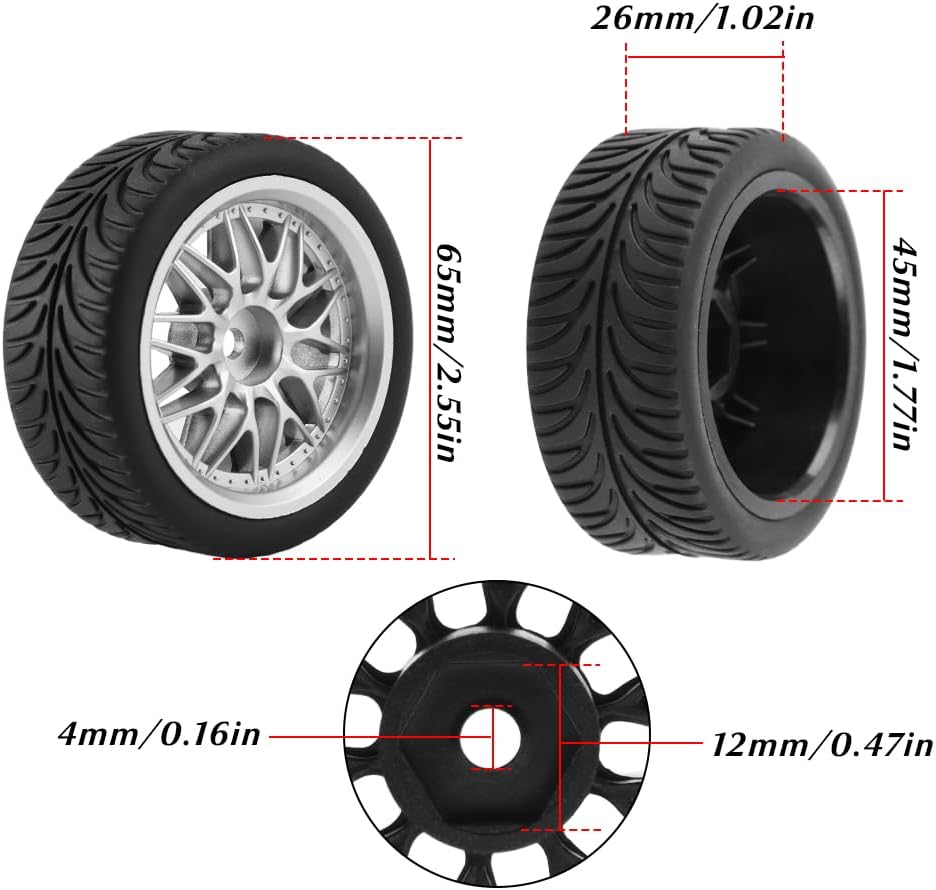 【Size】1/10 RC on road tires & wheels’ width about 26mm/1.02in; diameter about: 65mm/2.55in; drive hex: 12mm/0.47in.