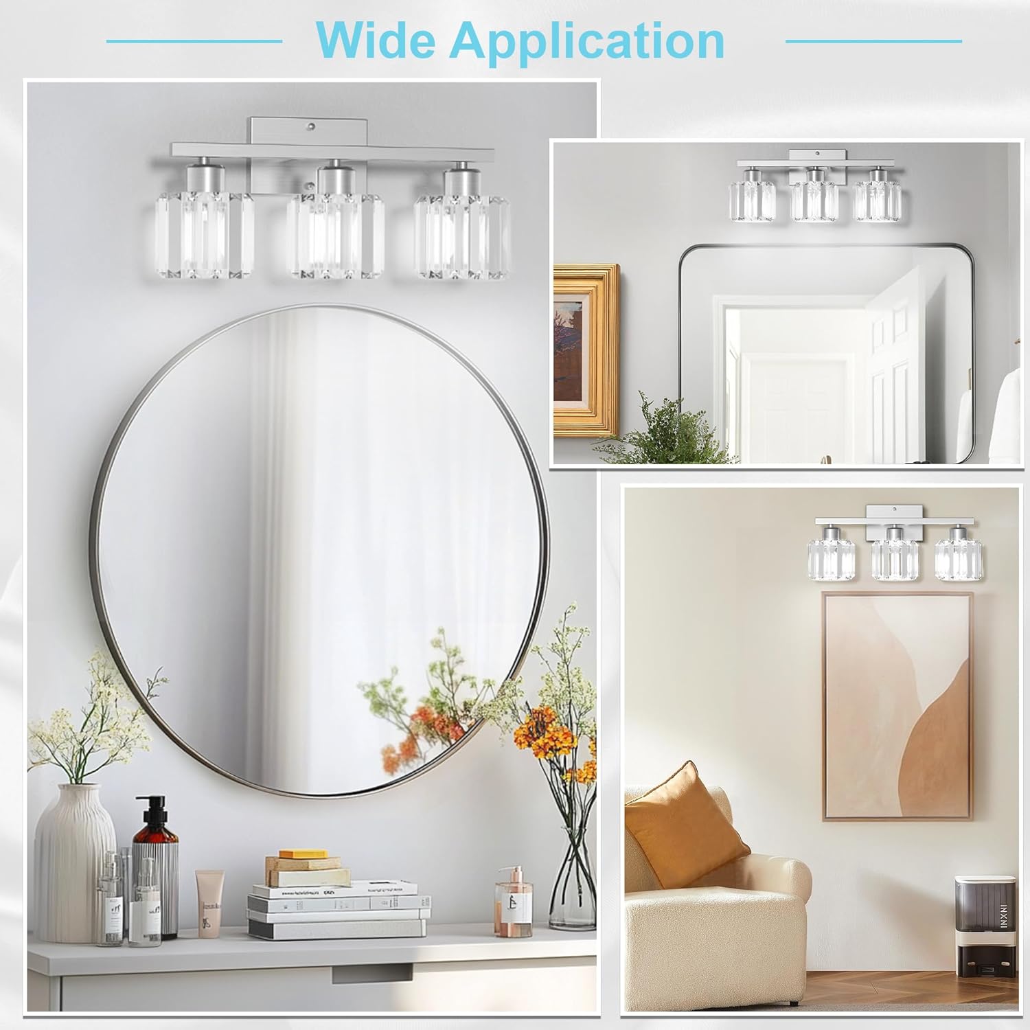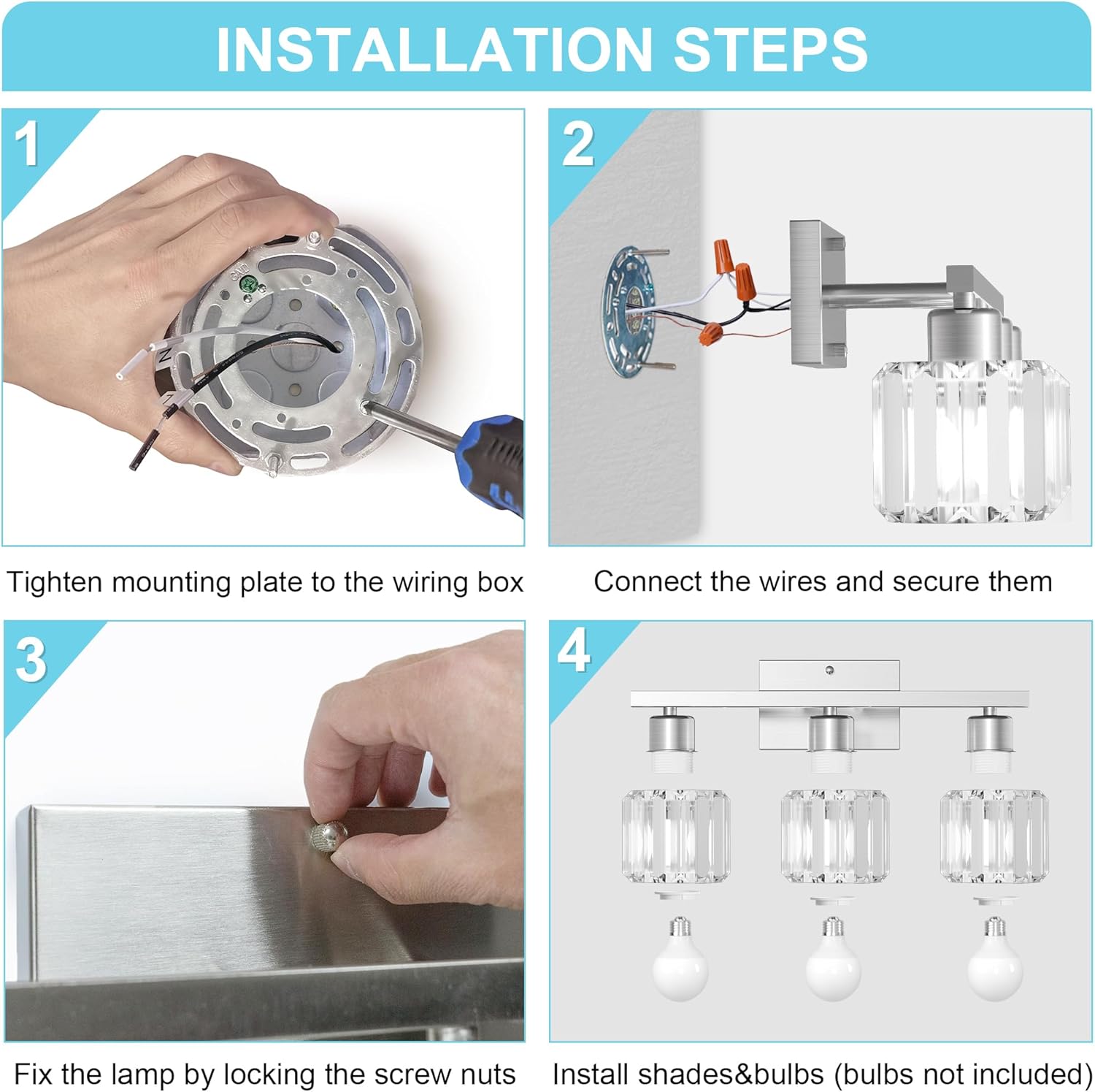 Easy Installation: The bathroom vanity light fixtures is easy to install and does not require complicated installation procedures. All required parts are included in the color box, and please note: Wear gloves during installation to avoid any scratches, and if you are unsure of the process, please install the crystal vanity lights fixtures under the guidance of an electrician.