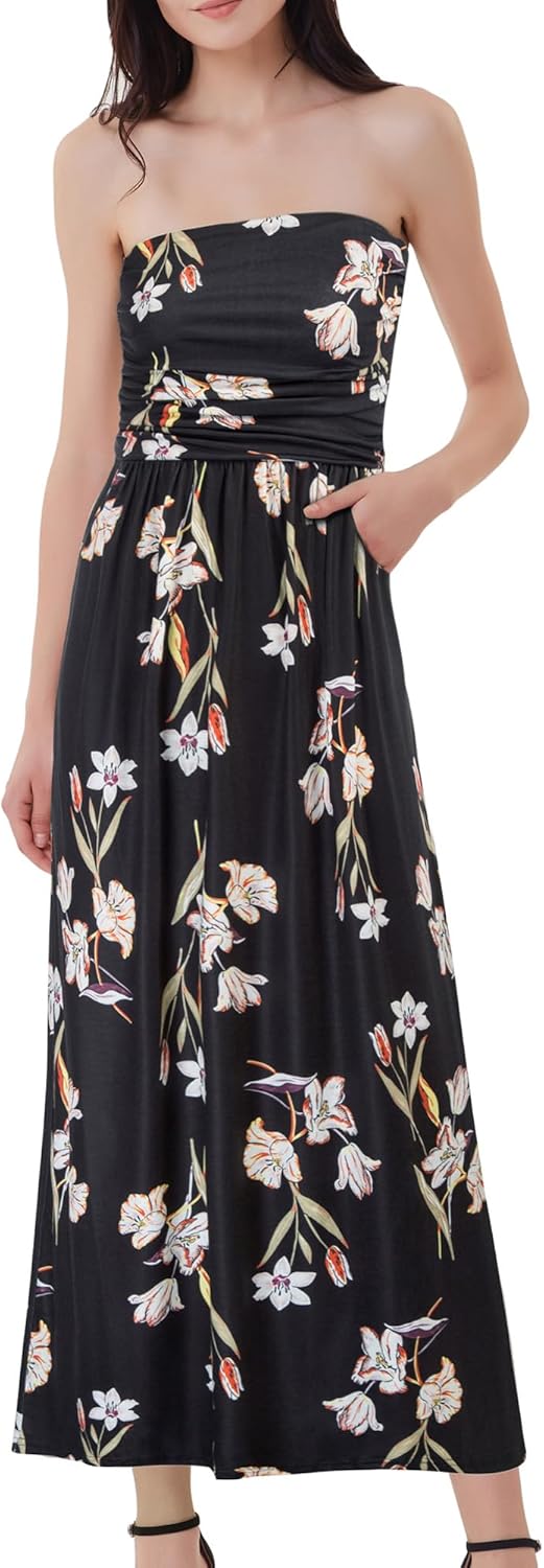GRACE KARIN Women Strapless Dress Casual Loose Ruched Long Maxi Dress with Pockets