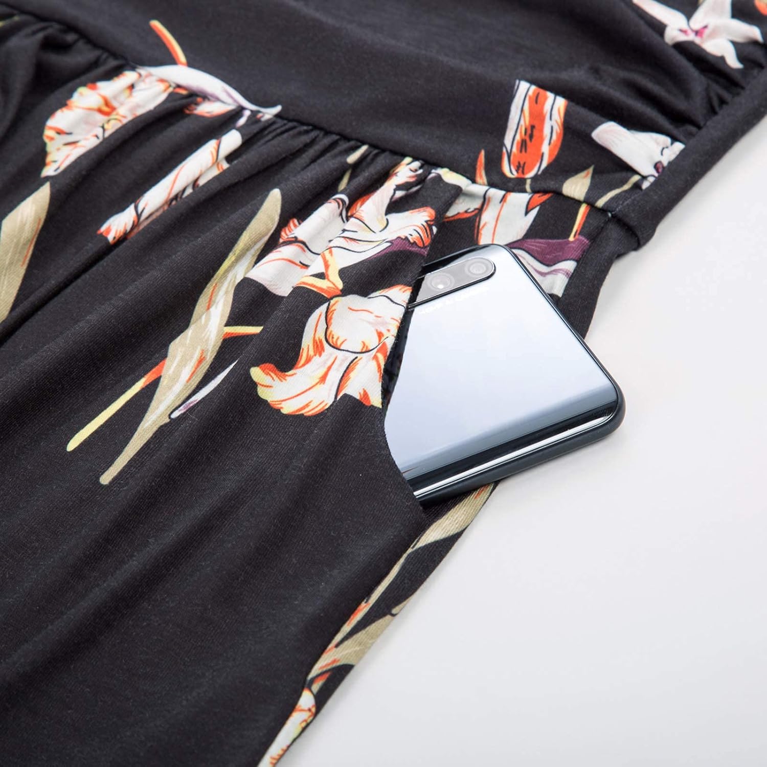 Customers find this dress comfortable and flattering, with one noting how the ruched midsection complements the stomach. The dress features well-placed pockets that fit phones and keys, and customers appreciate its perfect ankle-length fit. The material is thick and forgiving, making it suitable for summer wear, and customers consider it a perfect wedding guest dress.