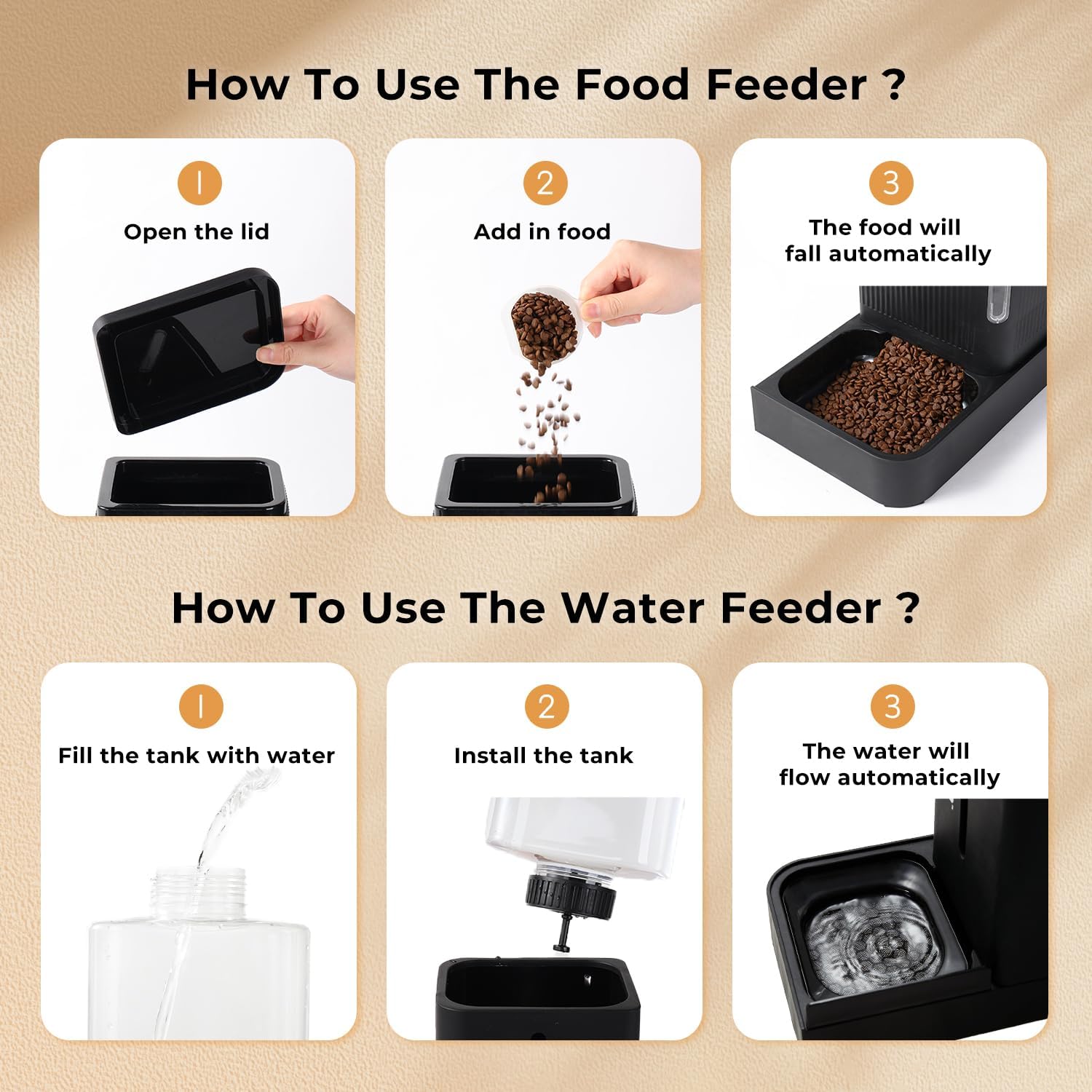 Pet Food and Water Dispenser Set: Automatic food feeder*1, water dispenser*1. Food feeder and waterer set suitable for small and medium dogs or cats. The cat feeder supply water and food automatically by gravity. No electricity is required. When placing the filtering plate of the water feeder, pay attention to the outlet hole facing inward, if the filtering plate floats up, you can use the water feeder without filtering plate.