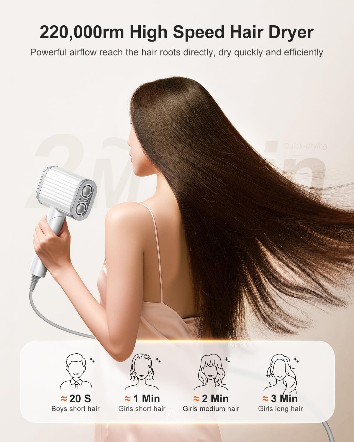 220,000 RPM Dual High-Speed Motors—New concept dual-motor high speed hair dryer which built in two 110,000 brushless motors generates ultra-fast airflow up to 38m/s. Redefined the hair-drying efficiency, 6X powerful airflow than traditional and single motor hair dryers.Tqcir dual-motor high speed hair dryer can dry short hair in just 1 minute, medium-length hair in 2 minutes, and long hair in only 3 minutes