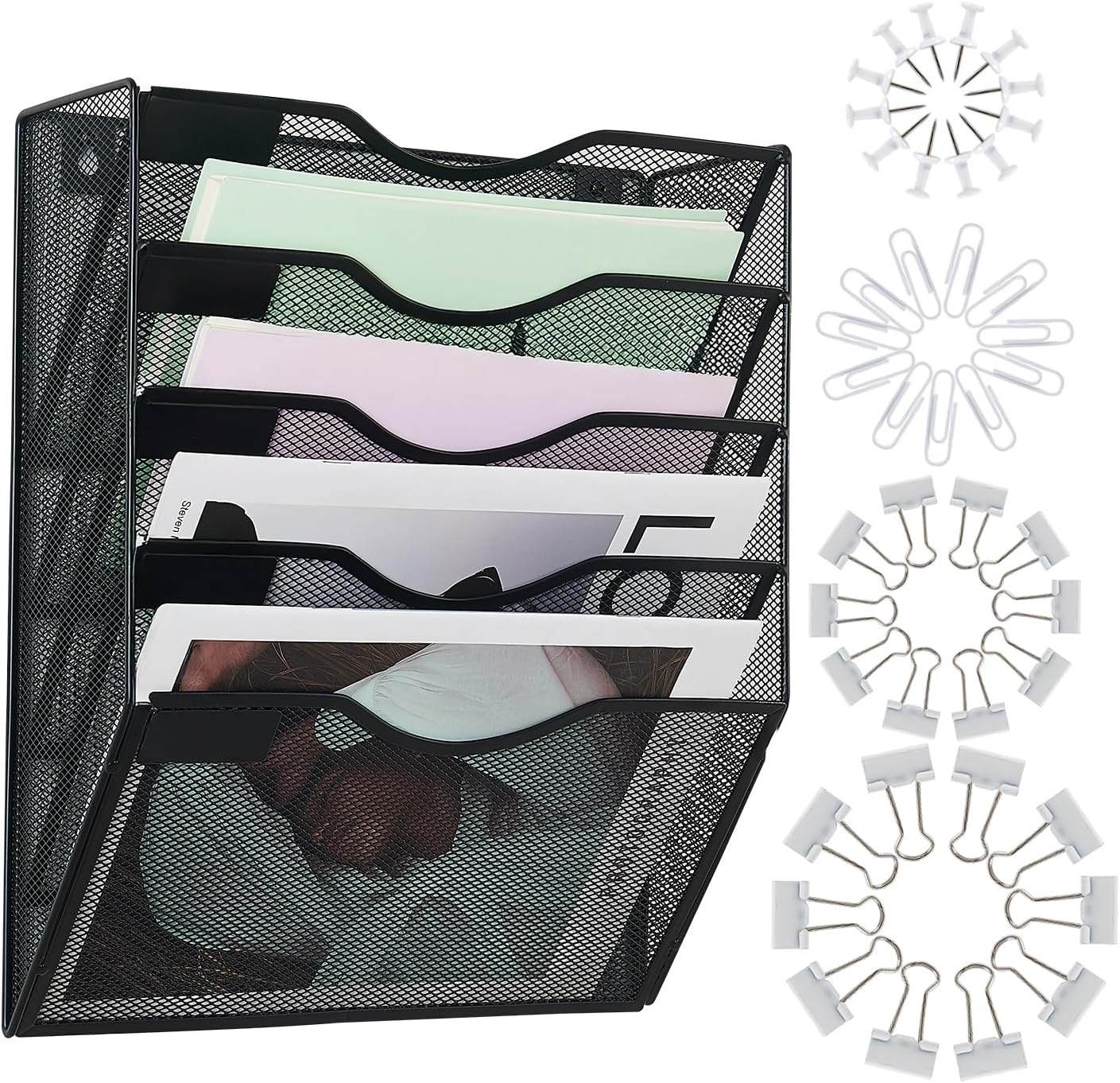 {Office Supplies Assorted} This wall file organizer comes with M-size binder clips*7, S-size binder clips*13, paper clips*26 and push pins*21, perfect and necessary office accessories assorted for your desk organization and storage. You can keep your files and papers always well organized