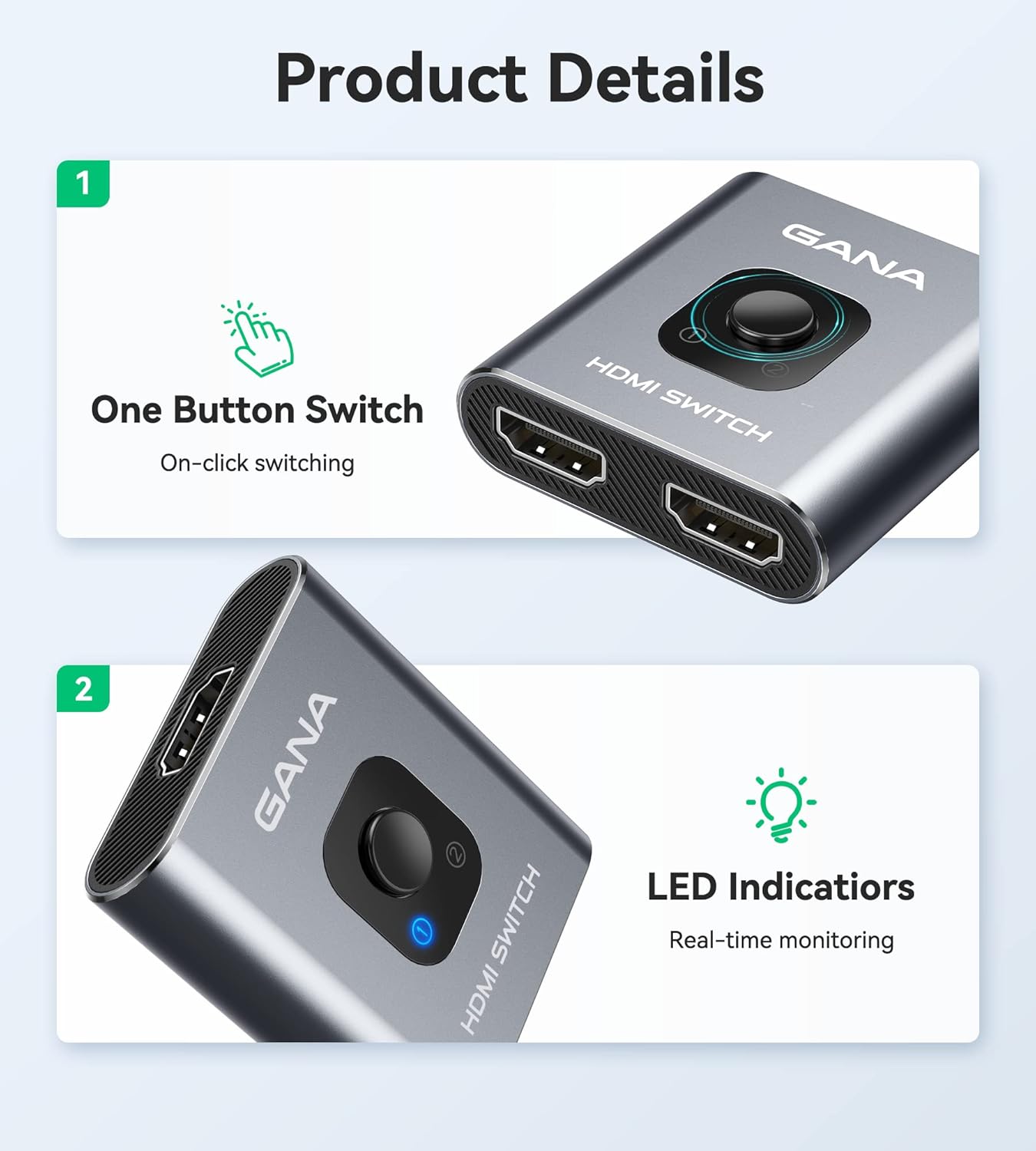 HDMI Switch 4k@60hz Splitter, GANA Aluminum Bidirectional HDMI Switcher 2 in 1 Out, Manual HDMI Hub Supports HD Compatible with Xbox PS5/4/3 Blu-Ray Player Fire Stick Roku