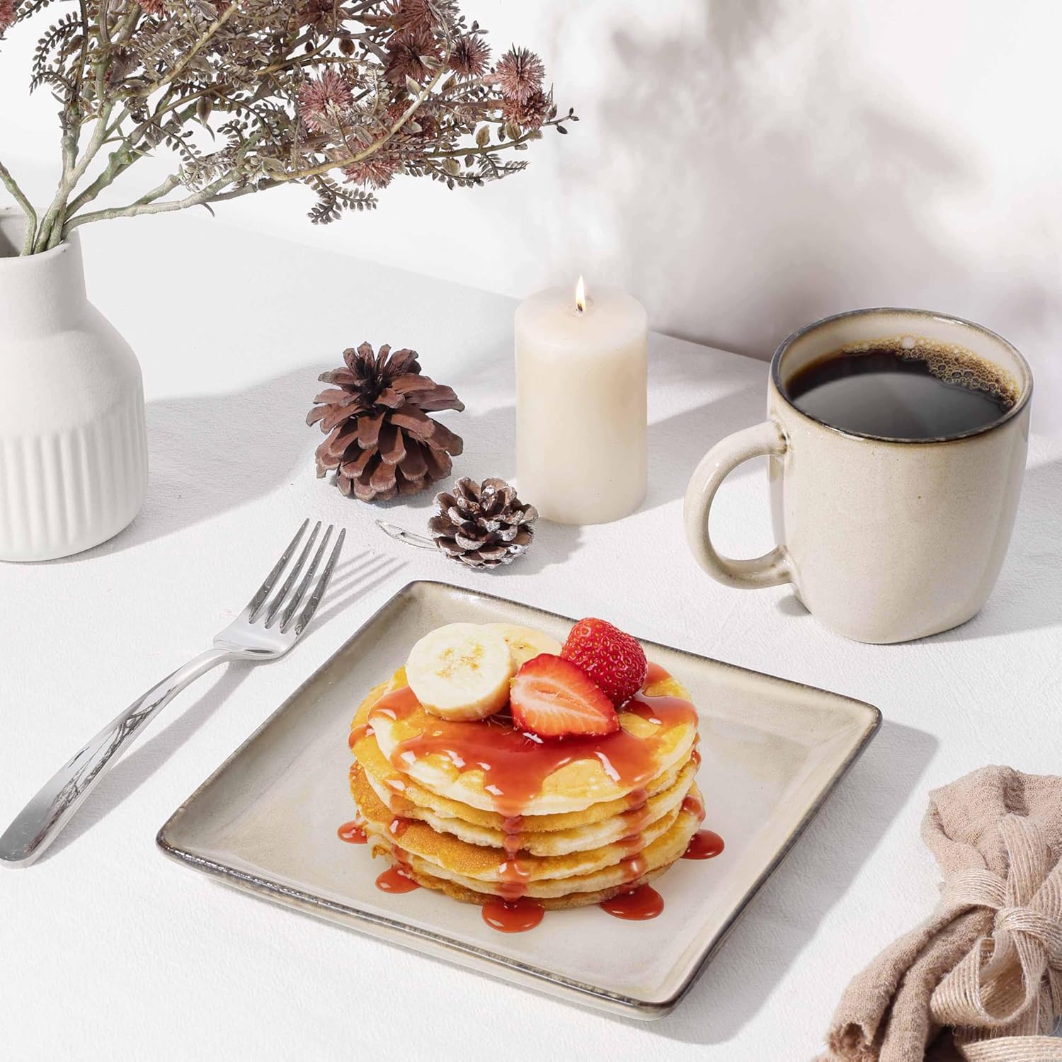 Slide-proof Bottom, each bowl and plate has one or two square on the bottom that are not covered by the glaze, this thoughtful design prevents accidental slips and skidding, making it ideal for everyday use, and is especially suitable for multi-age family members to use with peace of mind