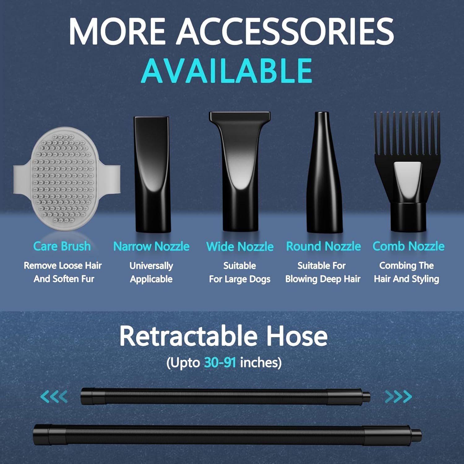 【Complete Accessory Set】Includes 4 interchangeable nozzles and a grooming brush to customize drying for any pet type. The ergonomic handle is compact and lightweight for easy portability. Plus, we’ve added a bonus bathing brush for seamless wash-and-dry sessions.