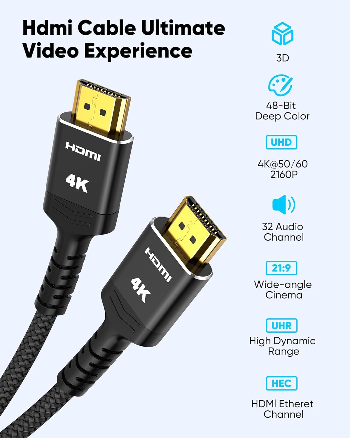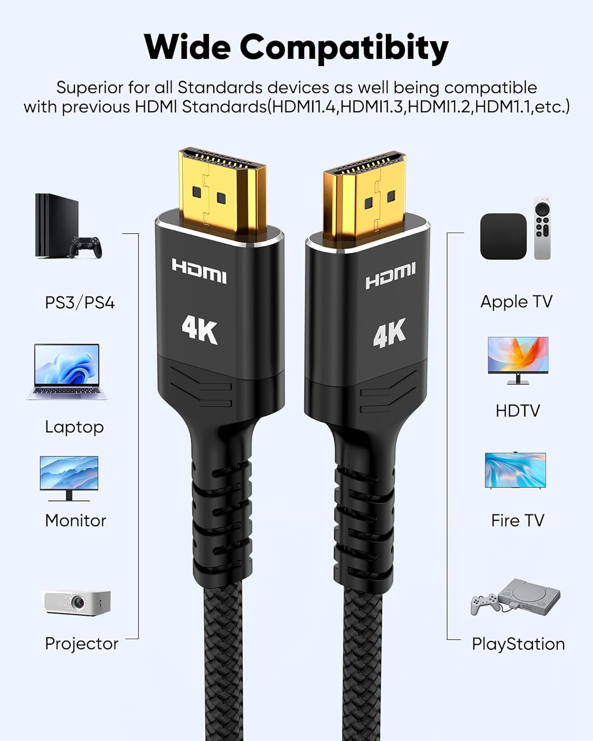 HD HDMI Cable 25FT:4K*2K Ultra HD technology with resolution up to 3840 x 2160@60 Hz,support 4K,3D and multiple view video.Enjoy full HD crystal-clear TV sound quality while experiencing deep colors and high-resolution images