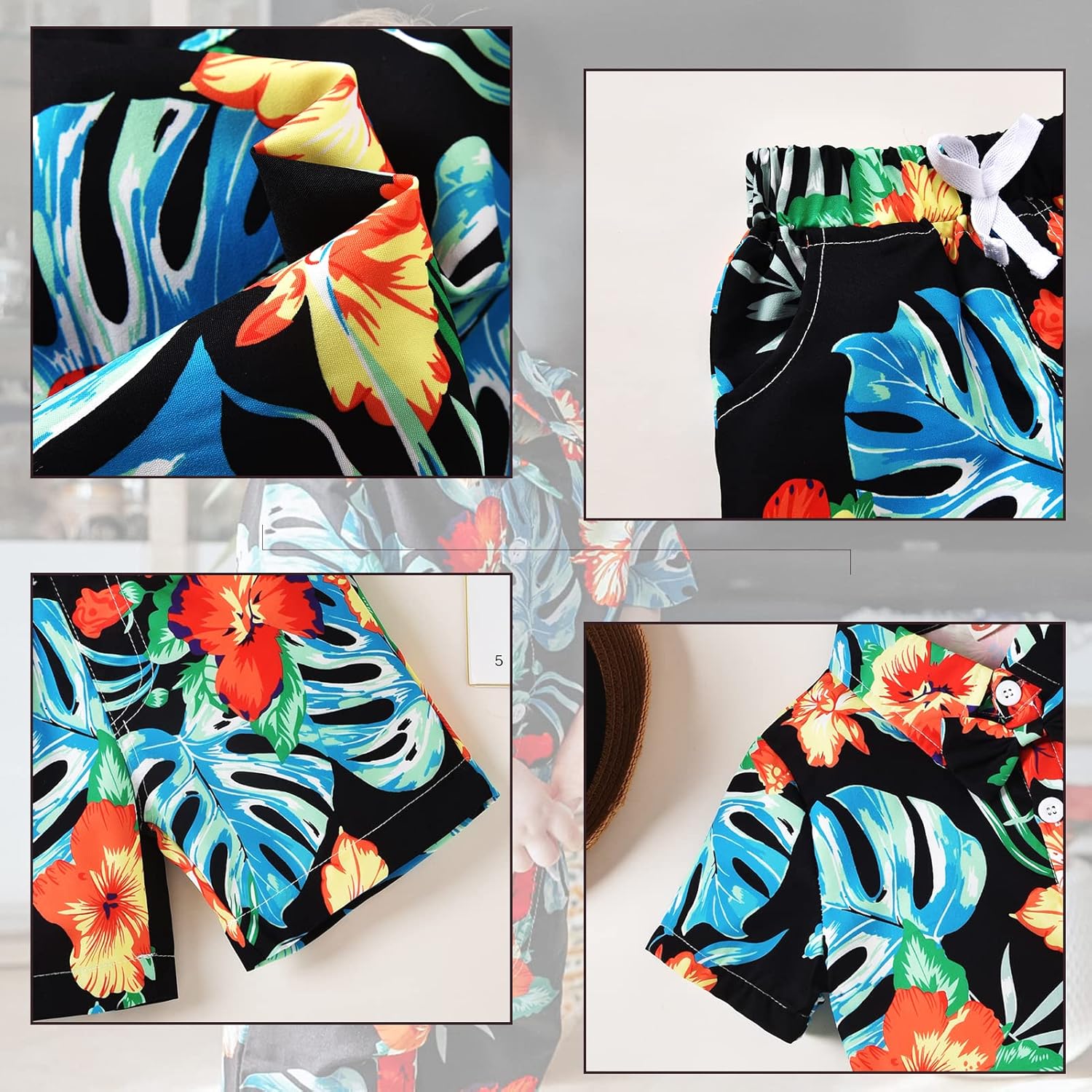 Soft To Wear- Great quality toddler boy summer shorts set, soft and comfortable cotton material; hand wash and machine wash are ok; perfectly for cute boy daily wear or outdoor wearClassic Hawaiian Design- Leaf printed shirt, matching elastic waist floral shorts, make your kids more attracktive in this summerSize Options-12-18 months 18-24 months 2T 3T 4T 5T tooddler boy Hawaiian outfits shorts set summer clothesMultiple Occasion- Suitable for beach wear / playwear / homewear for your little one, casual, photograph, family gathering, etc.Package Included- 1 × Toddler boy shirt + 1 × shorts