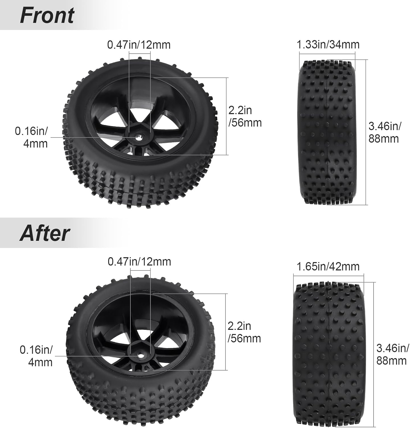 ✔ Size: Outer diameter(Height): 3.46″ (88mm) | Inner Diameter: 2.18”/56mm | Front Width: 1.33″ (34mm) & Rear Width:1.65″ (42mm) | Wheel Hubs size: 12mm Hex | Axle hole:0.16″ (4mm)