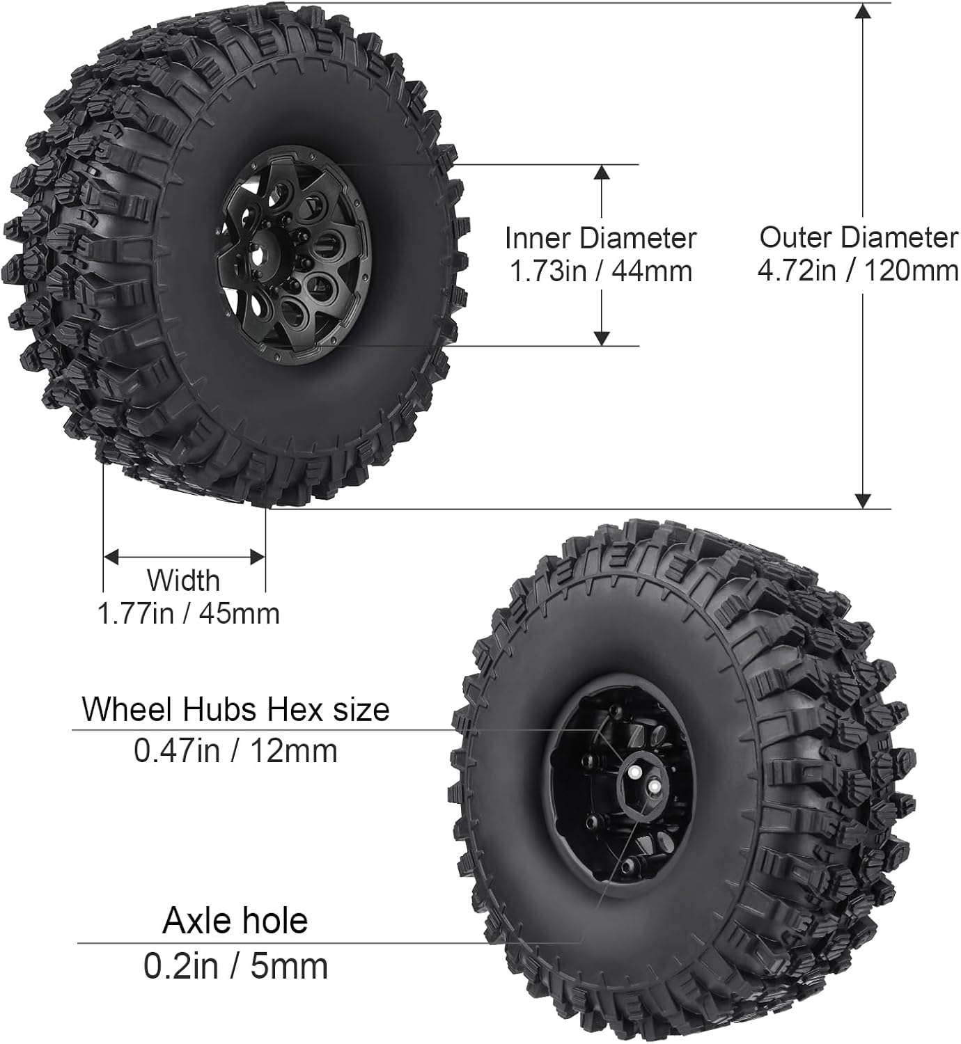 ✔ The 1.9 Tires Outer diameter(Height): 4.72 inches (120mm) | Inner diameter: 1.73 inch (44mm)| Width: 1.77 inches (45mm) | Wheel Hubs Hex size: 12mm | Axle Hole: 5mm