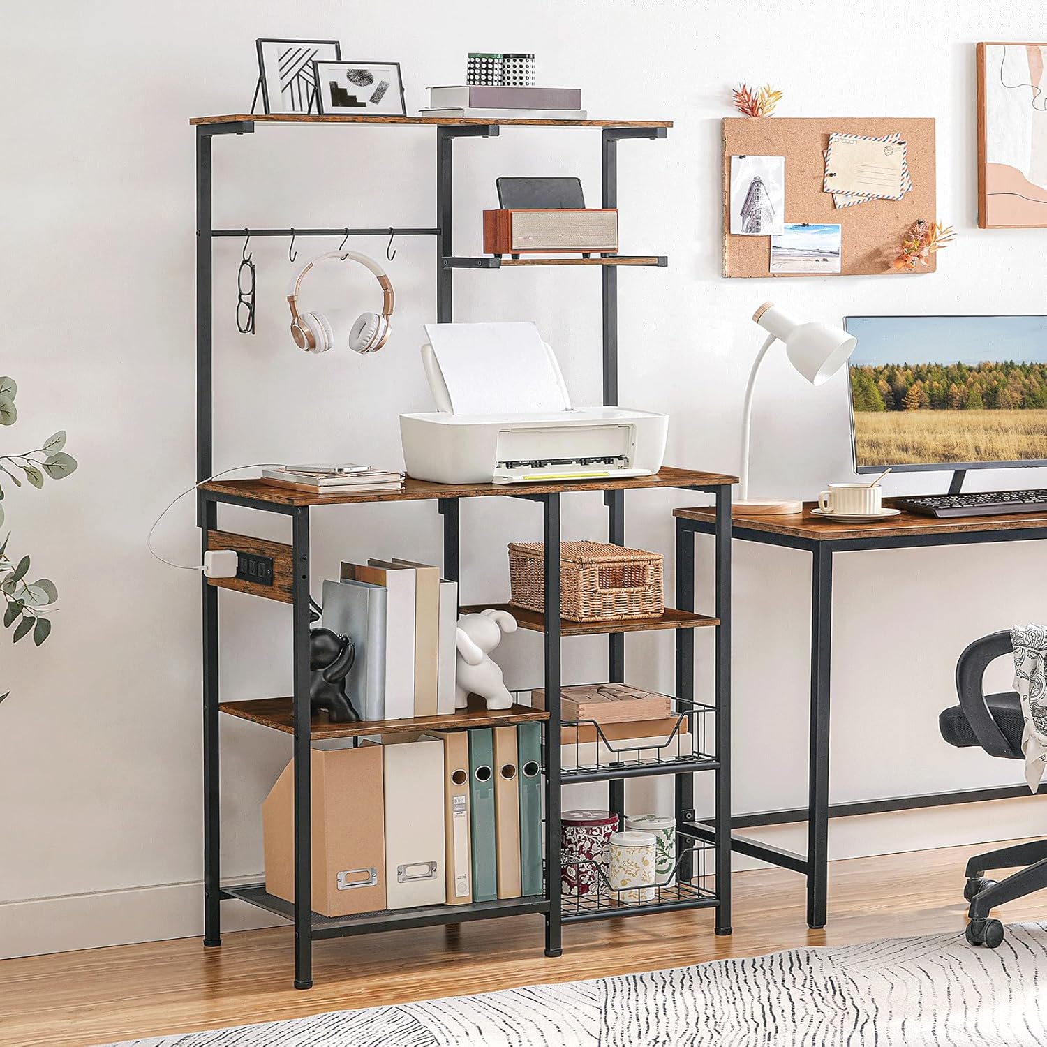 HOOBRO Large Bakers Rack with Power Outlets, 6-Tier Microwave Stand with 4 Hooks, Coffee Bar, Kitchen Shelf with Wire Basket, for Kitchen, Living Room, Office, Rustic Brown and Black BF64UHB01