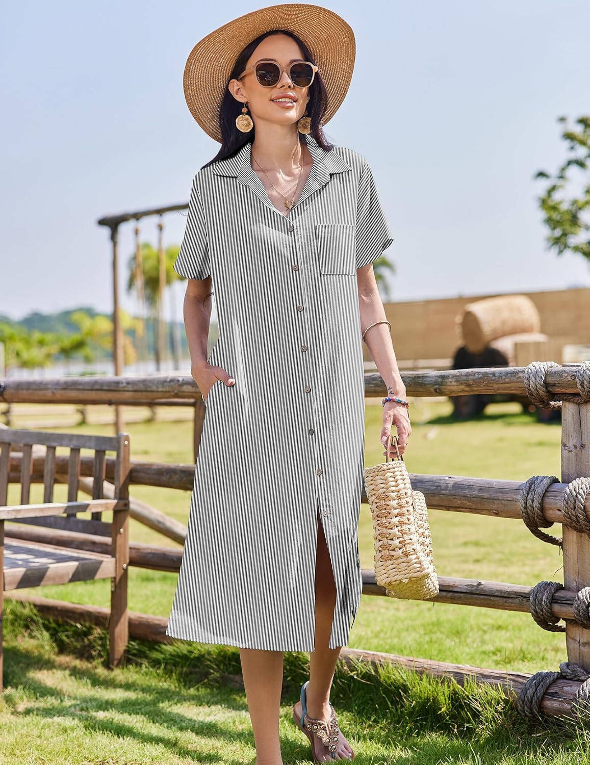 HOTOUCH Womens Summer Dress Stripe button down short sleeve shirt dress
