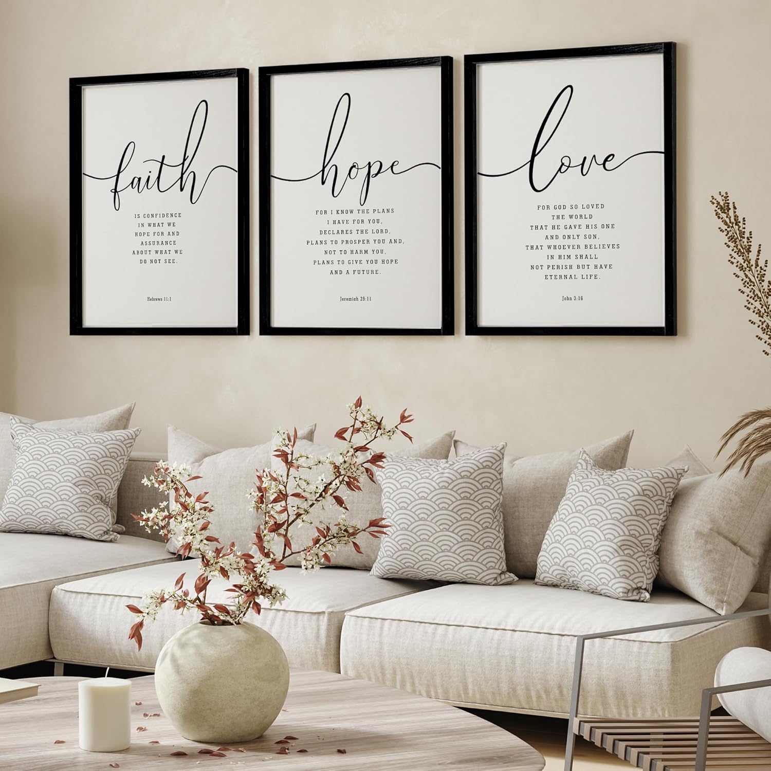 GREAT NEUTRAL ADDITION TO HOME WALL DECOR: “faith is confidence in what we hope for and assurance about what we do not see.” “Hope For I know the plans I have for you,” declares the LORD, “plans to prosper you and not to harm you, plans to give you hope and a future.” “Love For God so loved the world, that he gave his one and only Son, that whoever believes in him shall not perish but have eternal life.” Each part of the phrase is separated, as it gives a unique look. Modern farmhouse style combines rustic decor with modern elements.