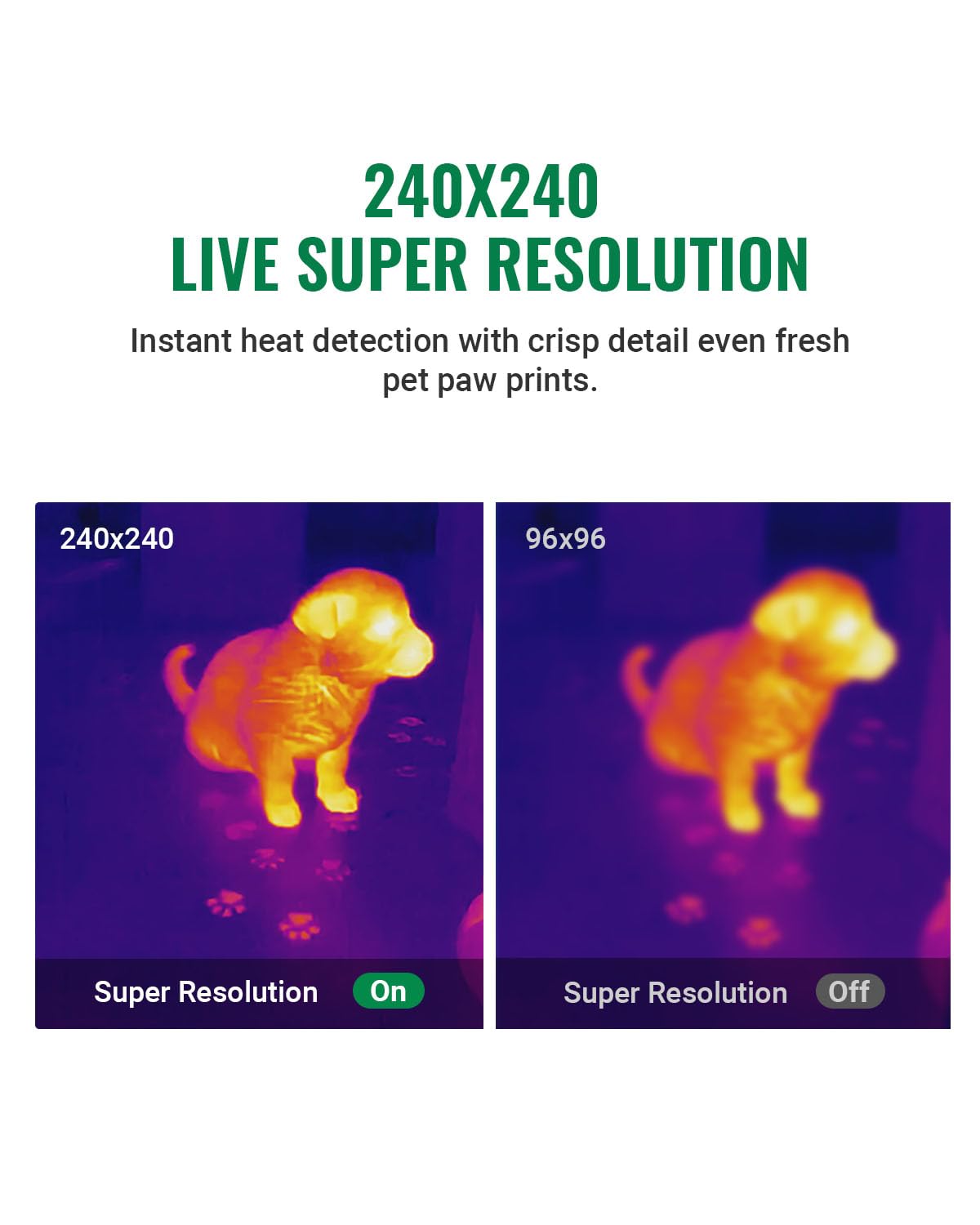 【Live Super Resolution】The HP96 Thermal Imager incorporates an upgraded Live Super Resolution algorithm, by enabling live super resolution technology during inspections, the thermal image clarity enhances from base 96×96 to 240×240 in real-time viewing and photo capturing.Thermal sensitivity below 50mk provides you with high-definition details, and the 25Hz high frame rate ensures a smooth screen browsing experience during anomaly checking.