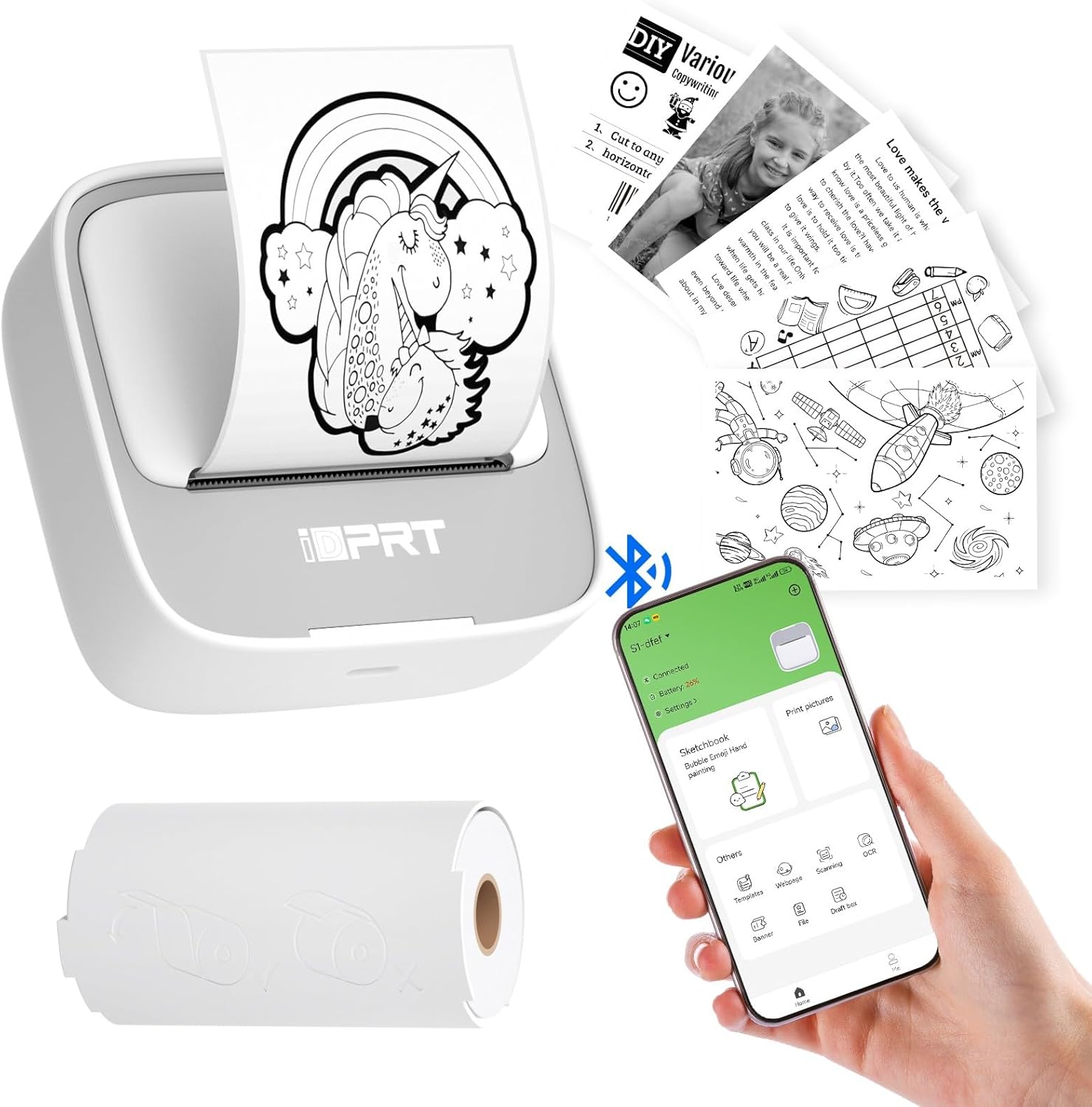 Inkless Printing: No ink or toner needed! This small printer uses thermal technology to deliver crisp, 203dpi black-and-white prints. It’s cost-effective, mess-free, and green—just load the thermal sticker paper and start printing. Perfect as a small printer for home use or a travel printer for on-the-go creativity