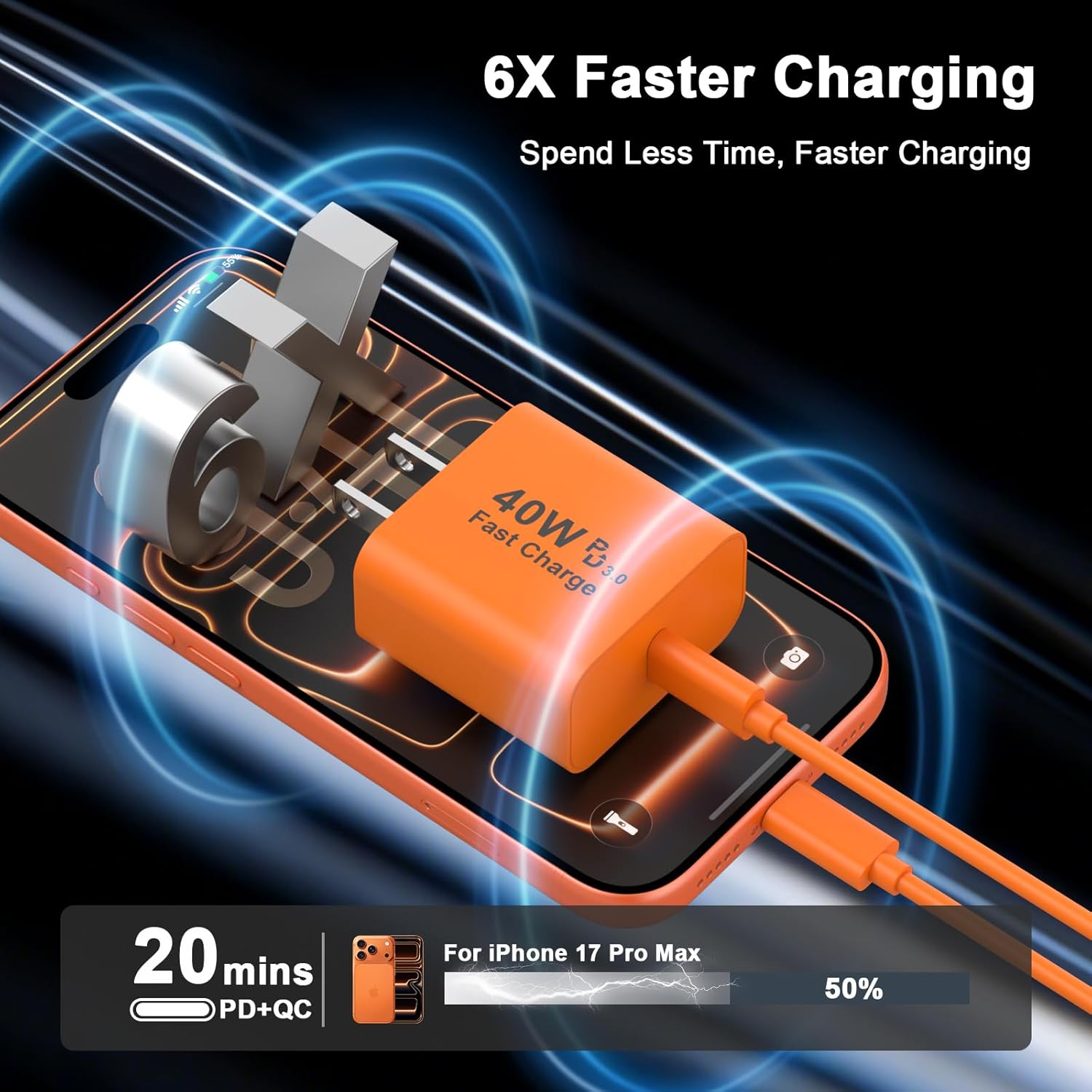 40W USB C iPhone 17 fast charger with 10ft Type c to Type C cord, charges iPhone 17 Pro Max up to 50% in just 20 minutes, which saves more than 2 hours when compared to the 5W original charger.