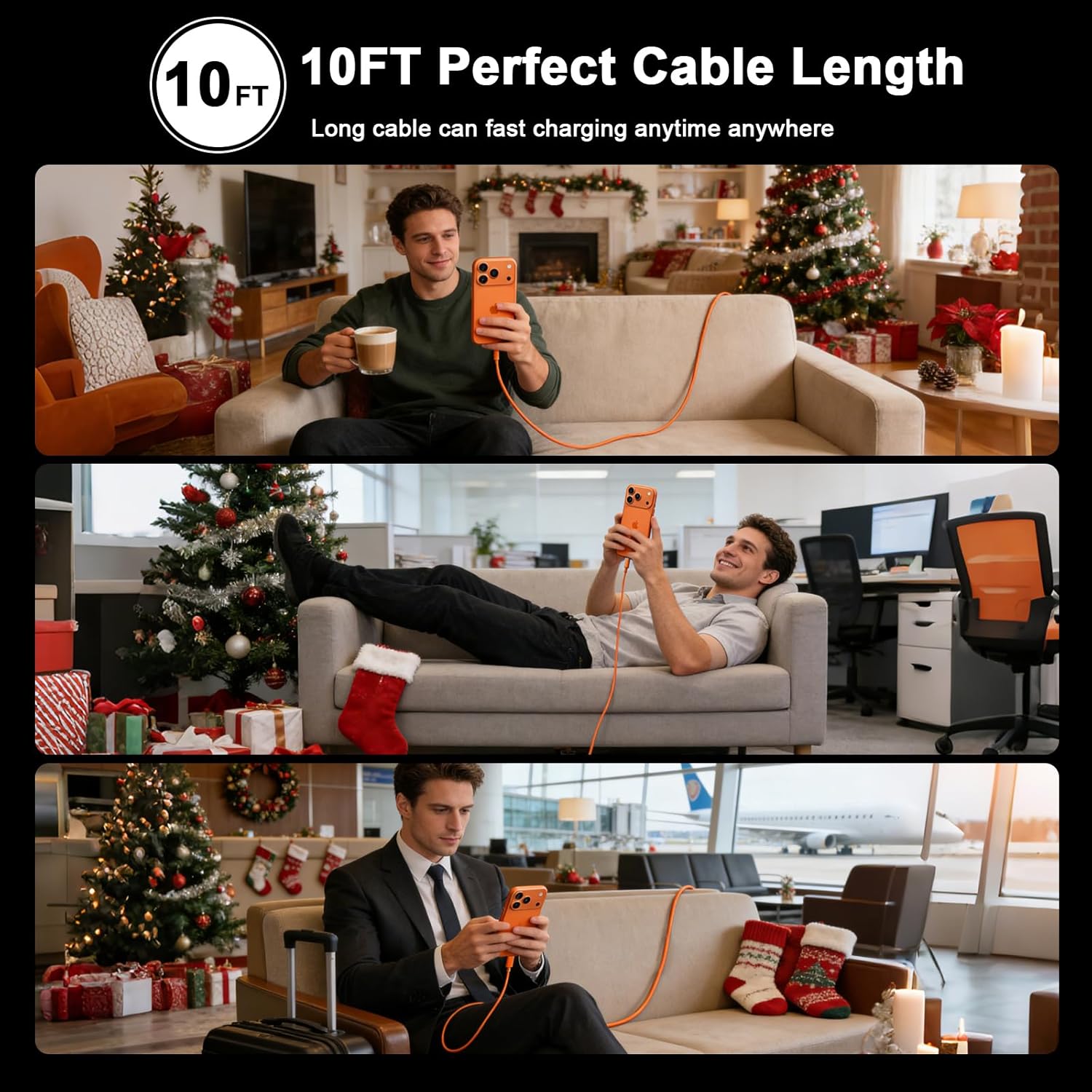 3. The 10ft long iPhone charging cable length allows you to charge your iPhone/iPad from an extra-long distance, making your life more easier and convenient.