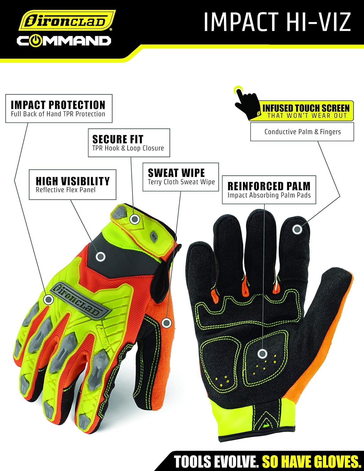 The Ironclad Command touchscreen impact glove is ironclad’s answer to maximum hand protection. This glove features impact protection on the back of hand through the thermoplastic rubber that protects the knuckles and metacarpals. However it doesn’t stop there with impact protection The open cell memory foam pads on the palm of hand Are strategically placed to absorb impact and vibration when using hand and power tools. Even with the added impact protection The synthetic leather palm remains fully touchscreen enabled. It also benefits from ironclad’s exclusive 16-point measurement system for a performance fit with a no bulk feel.