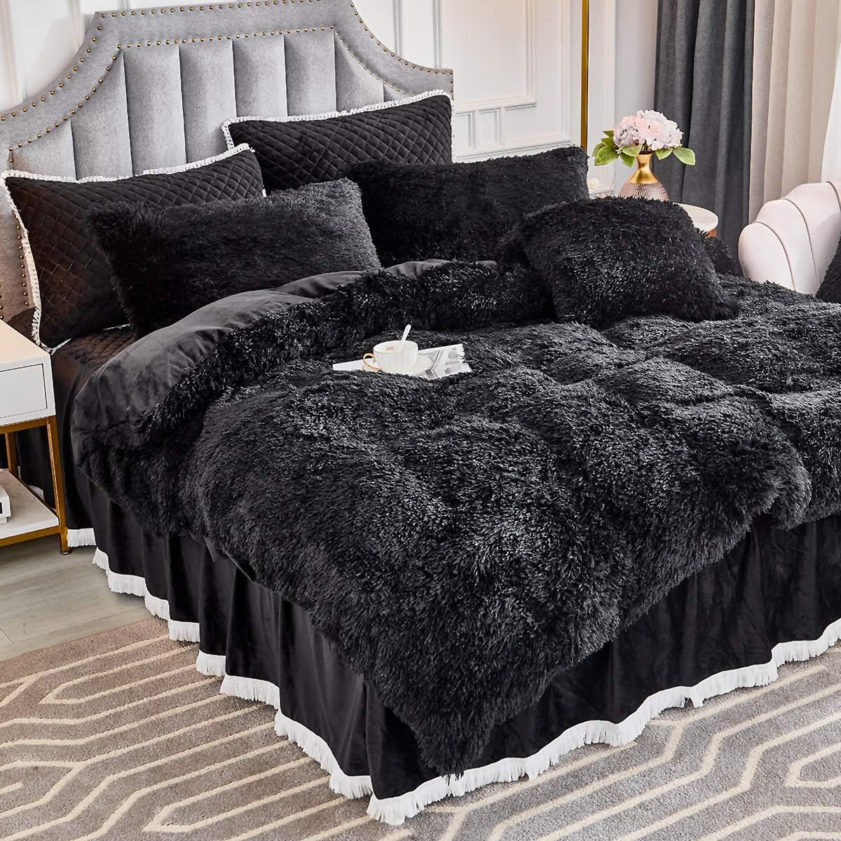 JAUXIO Faux Fur Fluffy Comforter Duvet Cover with Pillowcases Luxury Shaggy Bedding Set Ultra Soft Crystal Velvet Reverse (Black, King)