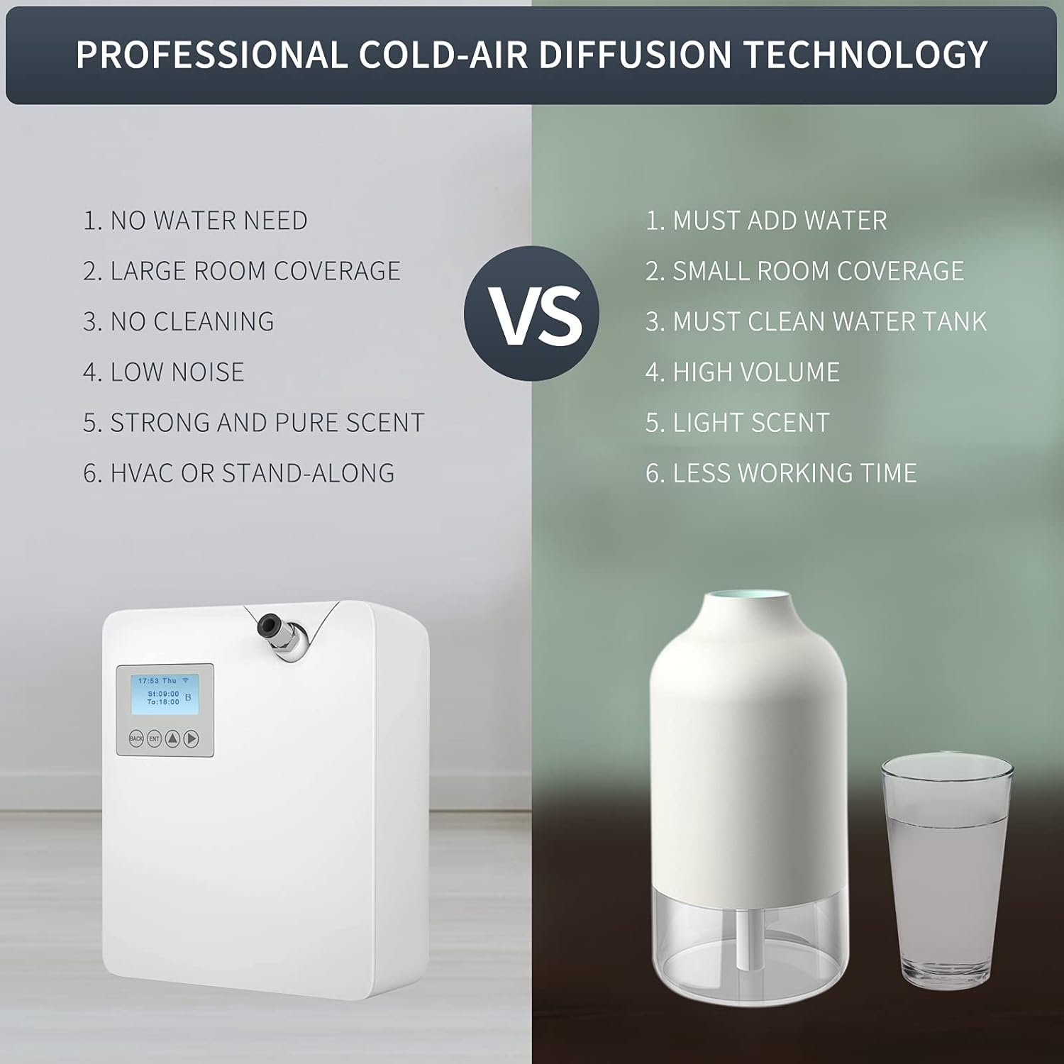 【Experience the Power of Cold Air Technology】Our JCLOUD scent air machine is a game changer! Unlike traditional ultrasonic diffusers, our diffuser compresses cold air to convert essential oils into dry mist micro-particles, ensuring maximum utilization and high efficiency. No water or heat is needed, so you can enjoy the amazing benefits of aromatherapy without any mess or hassle. Say goodbye to unpleasant pet or smoke odors and hello to a fresh, clean and delightful environment!