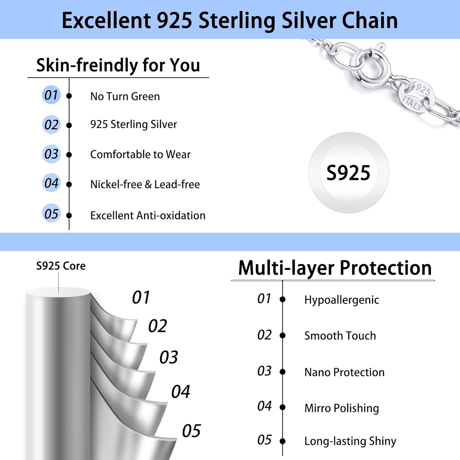 The rose gold necklace chain is 925 sterling silver plated with 18k plating gold. It’s lead-free and nickel free.