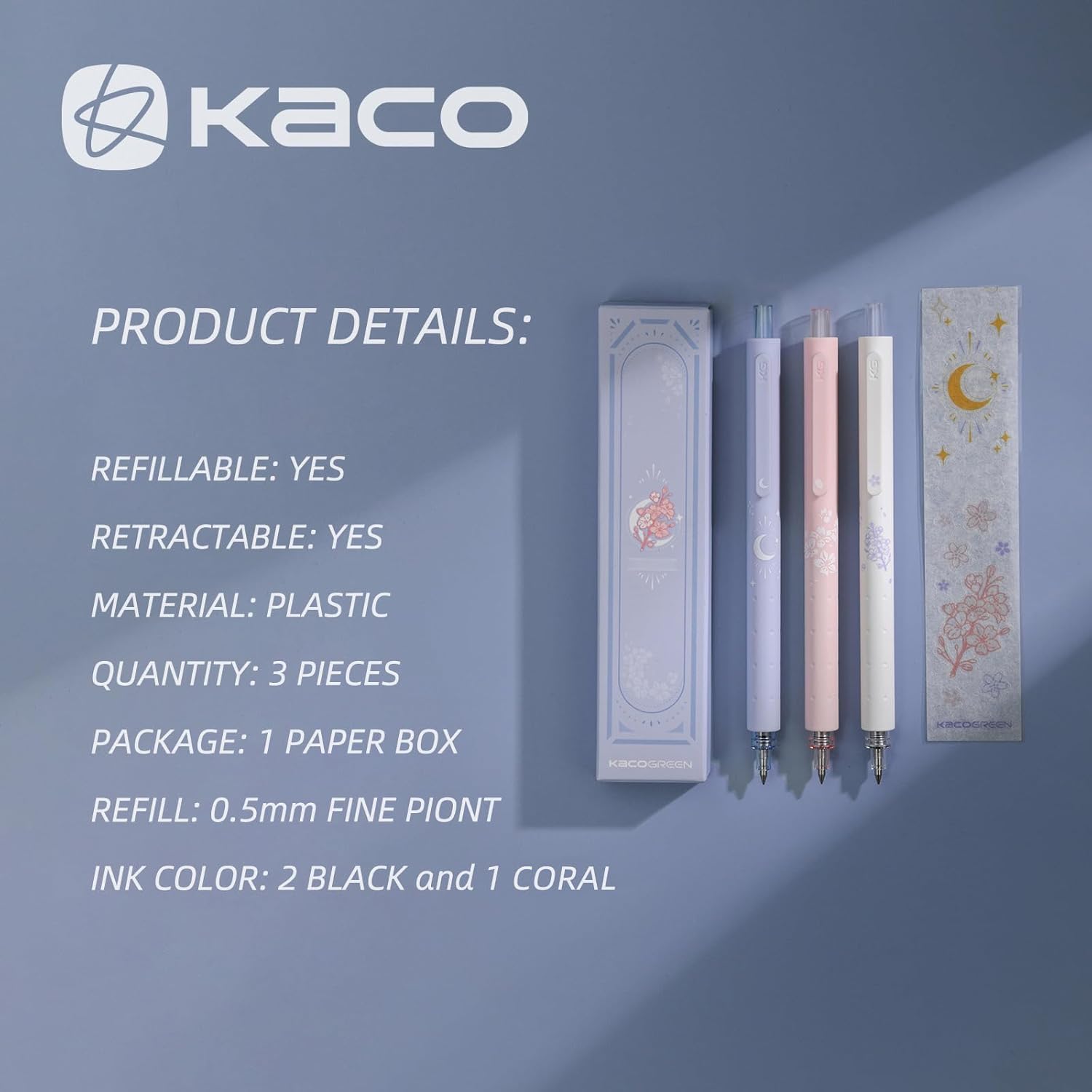 KaCo Gel Pens Cute Stationery 3 Pieces 0.5mm Fine Point, Quick Drying Pens for Journaling Aesthetic Office Supplies, 2 Black Ink and 1 Coral Ink