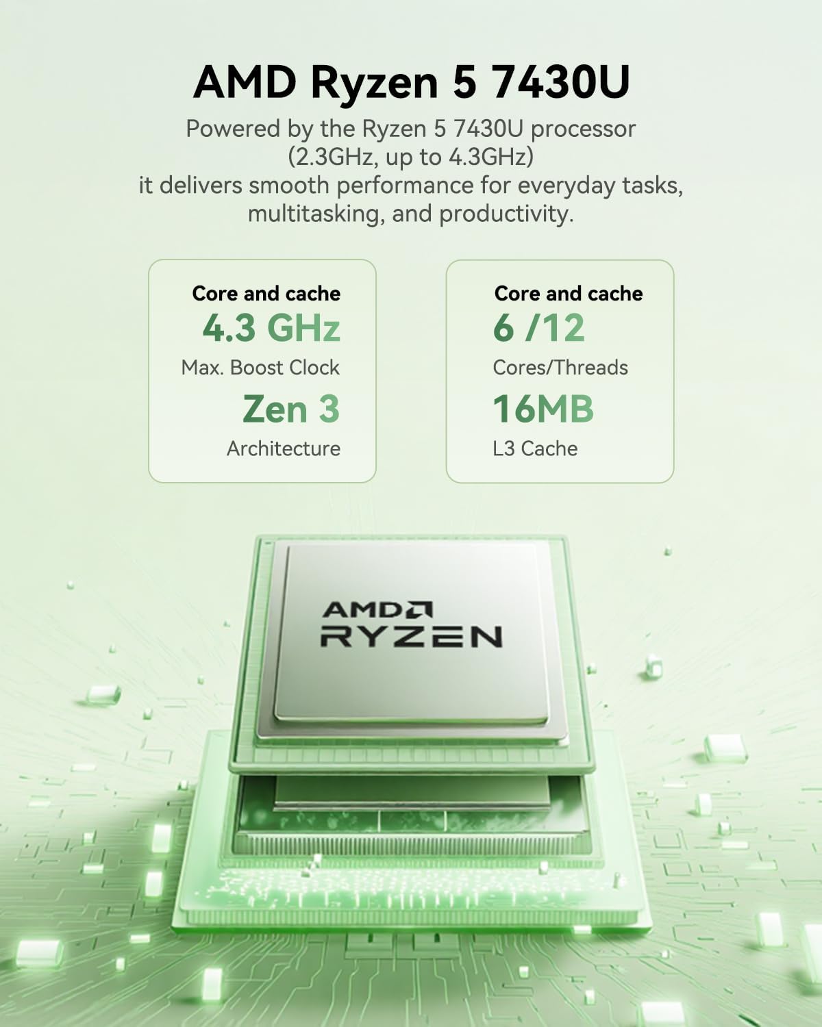 【2025 Enhanced Edition Ryzen AMD 7430U 】The mini computers is equipped with 2025 Enhanced Edition Ryzen 5 7430U AMD processor (6C/12T, up to 4.3GHz). featuring efficient 45W power consumption and a CPU TDP of up to 28W. Based on the 7nm FinFET processor technology and ZEN 3+ architecture, this small but powerful mini pc excellent performance across productivity, multitasking, and gaming.