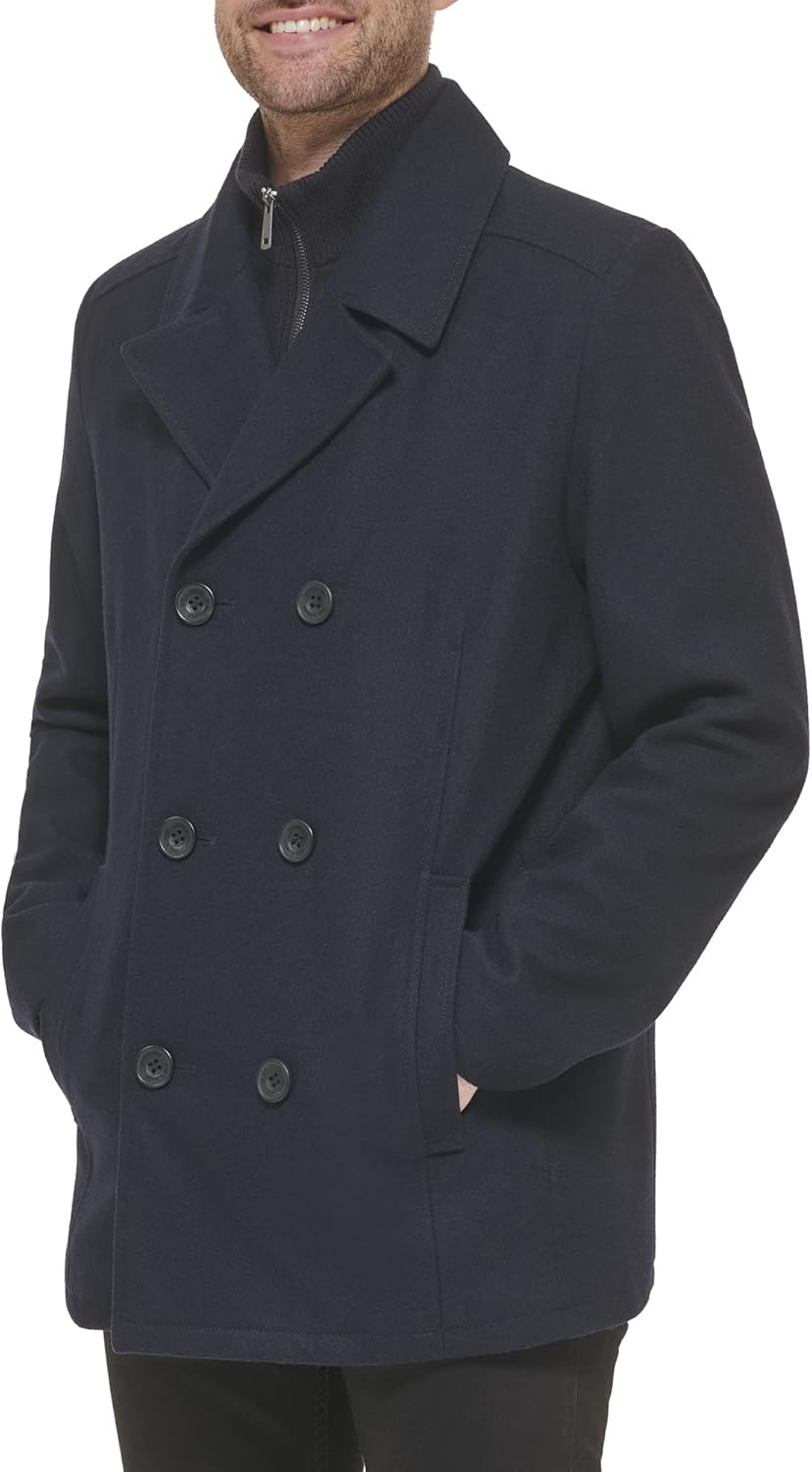 This Kenneth Cole Men’s Men’s Outerwear COAT is a Wool Pea Coat BUTTON FRONT CLOSURE Notched lapel SIDE ENTRY HAND POCKETS Knit Bib