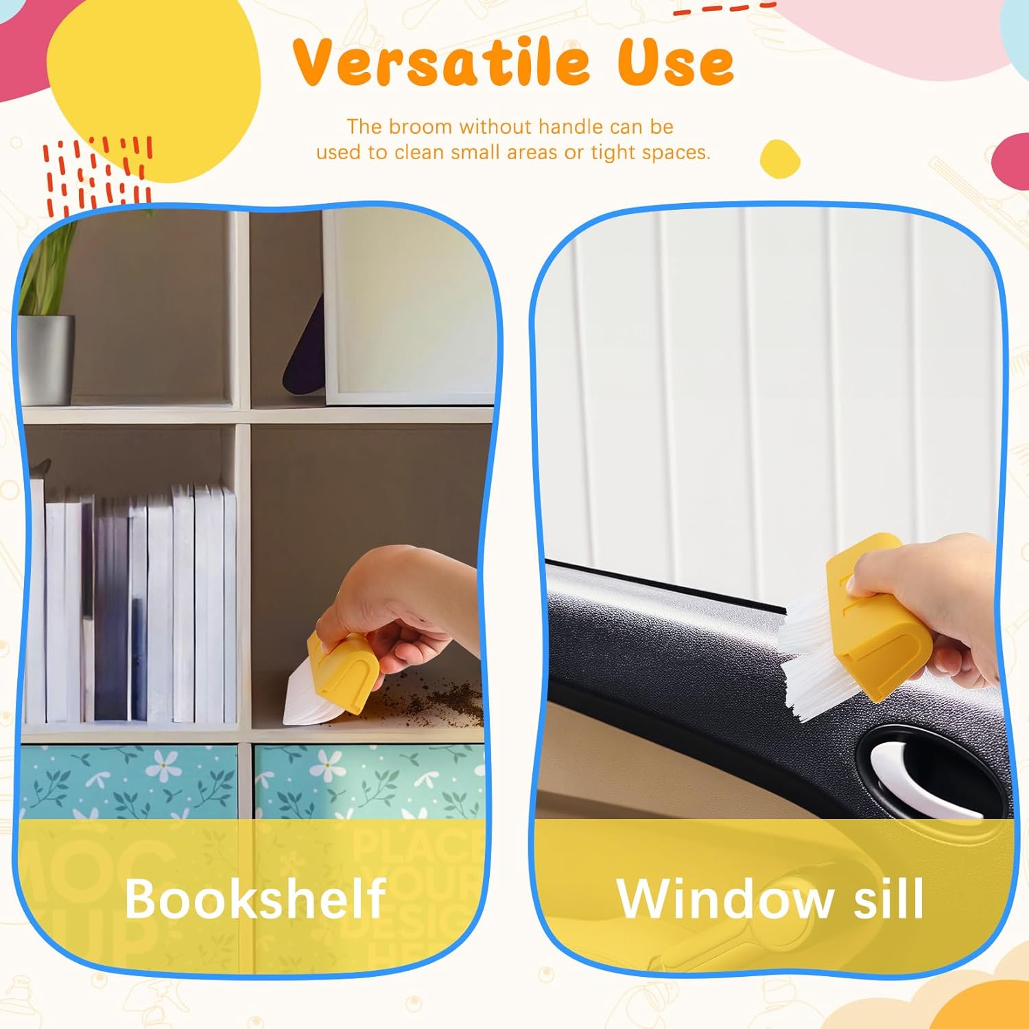 Versatile Use: Kids cleaning broom with handle off can be used to clean small areas or tight spaces, such as crevices in bookshelves, small crumbs on desktops, car window crevices, window sills, etc., especially for hard to reach places.