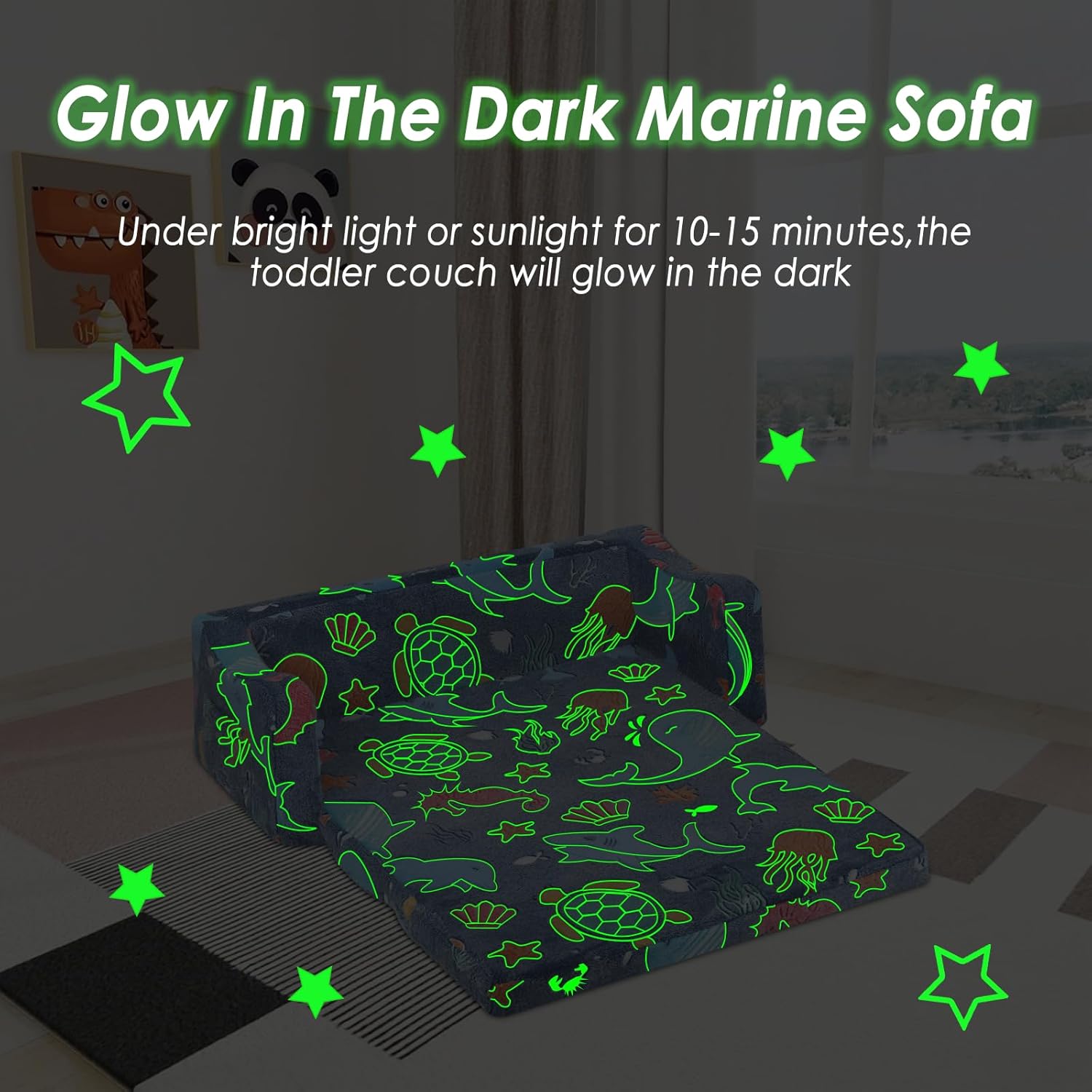 Glow-in-the-dark design: Features a unique luminous design with a cute marine animals pattern.Under bright light or sunlight for 10-15 minute,the toddler couch will glow in the dark
