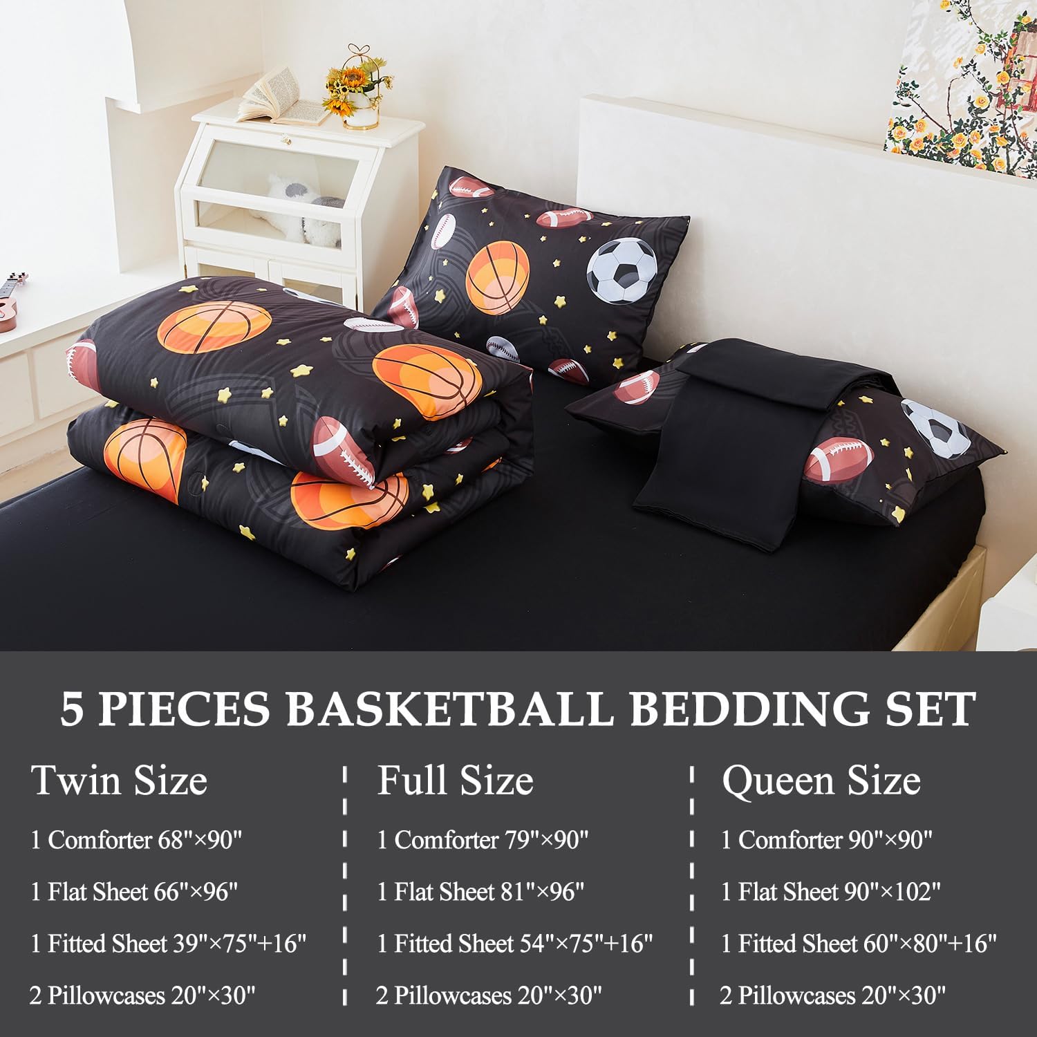 Kids Sports Full Bedding Set Black Basketball Baseball Football Comforter Set for Boys Girls Reversible 5 Pieces Bed in A Bag with Sheets(Black Balls, Full)