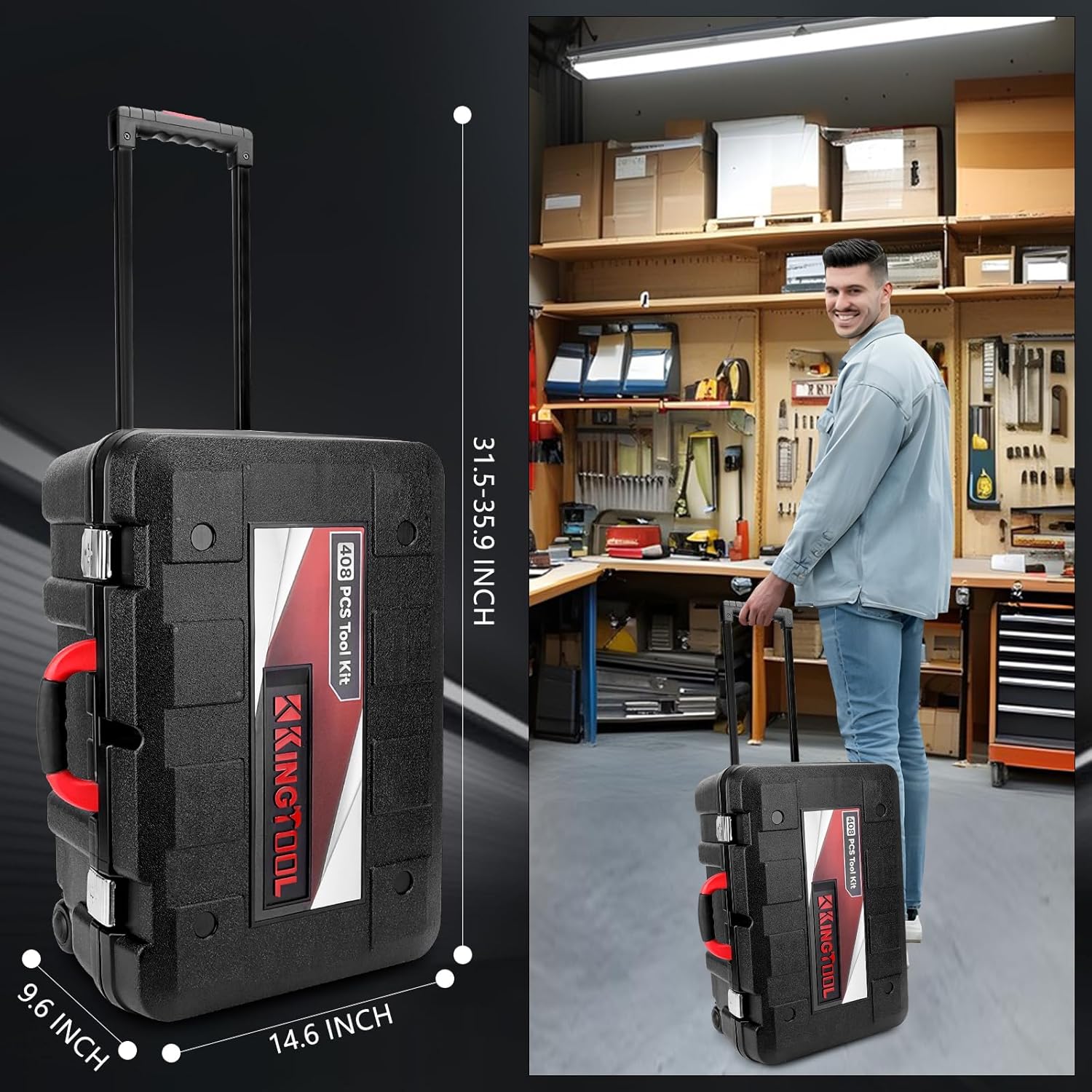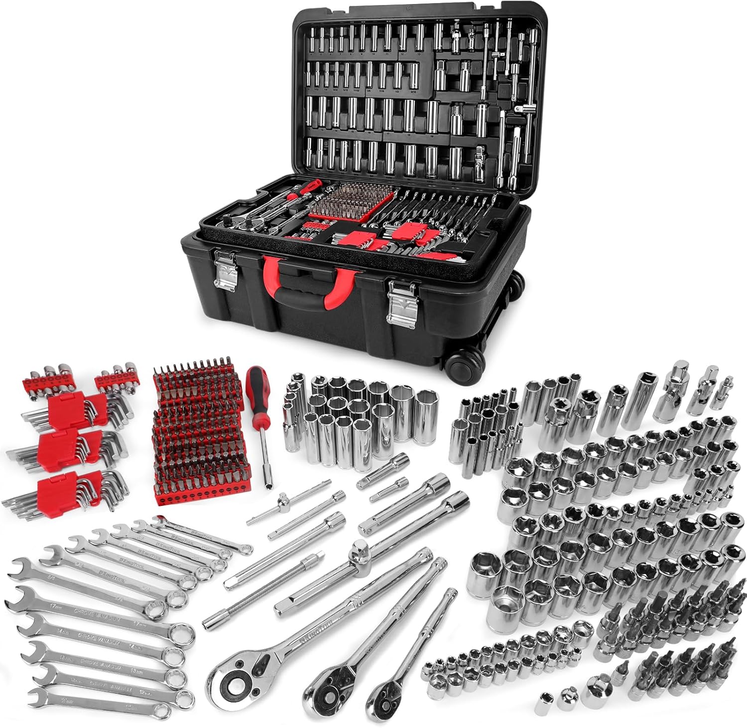 UPGRADED HIGH-CAPACITY STORAGE CASE: The heavy-duty blow-molded tool box has a stylish suitcase design with 360° swivel wheels. Tools are organized and easily accessible, with size markings for quick identification