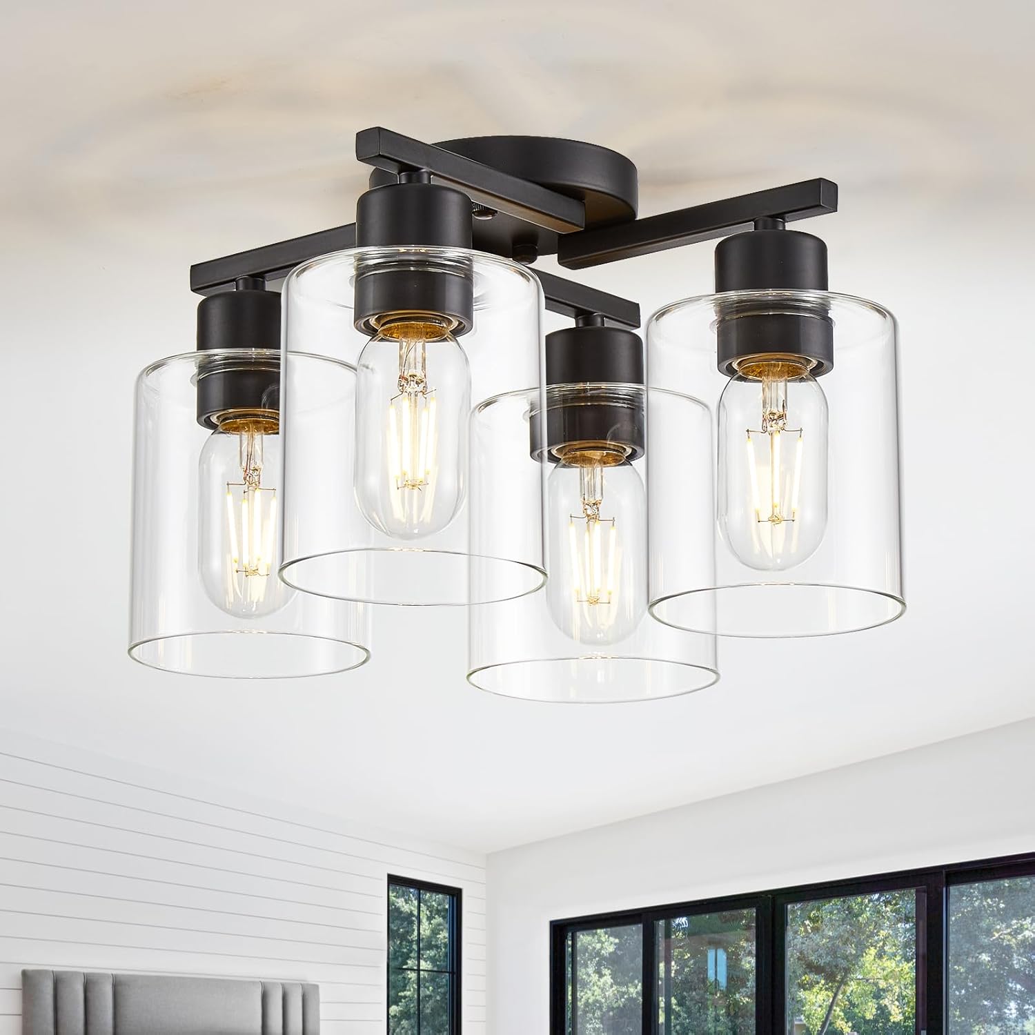 Kitchen Lighting Fixtures Ceiling, Black Semi Flush Mount Ceiling Light, 4 Light Kitchen Light Fixtures Cieling Lights with Clear Glass Shade for Bedroom Foyer Farmhouse Hallway