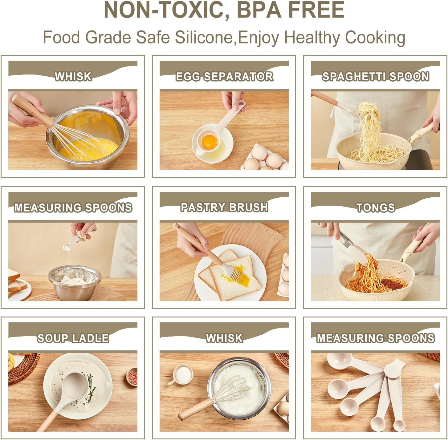 Each kitchen utensils set is made from soft, food-grade silicone that’s completely non-toxic, BPA-free, and gentle on nonstick cookware.