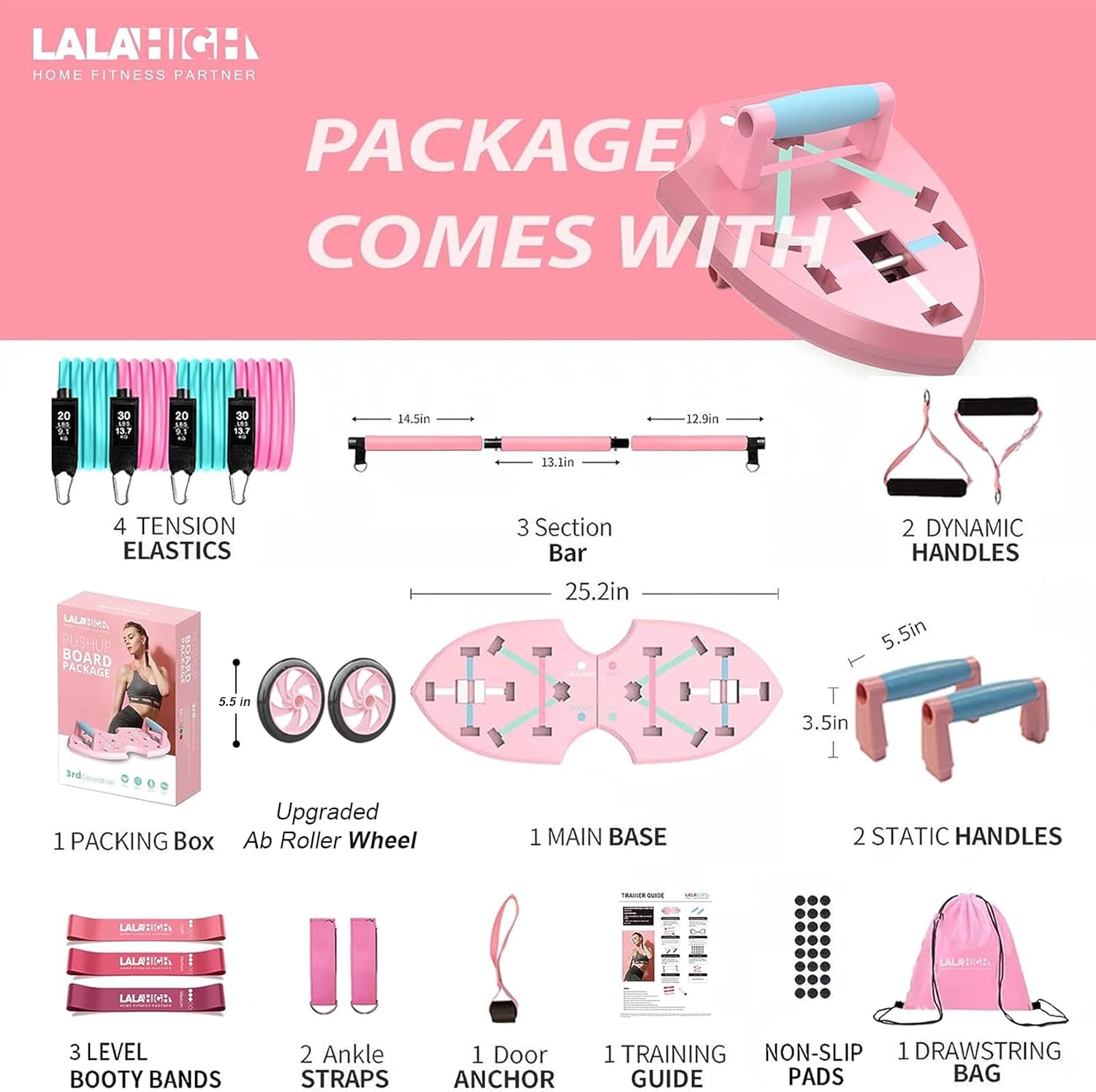 LALAHIGH Portable Home Gym System for Men and Women:Push Up Board, Pilates Bar & 20 Fitness Accessories with Resistance Bands and Ab Roller Wheel-Professional Strength Training Exercise