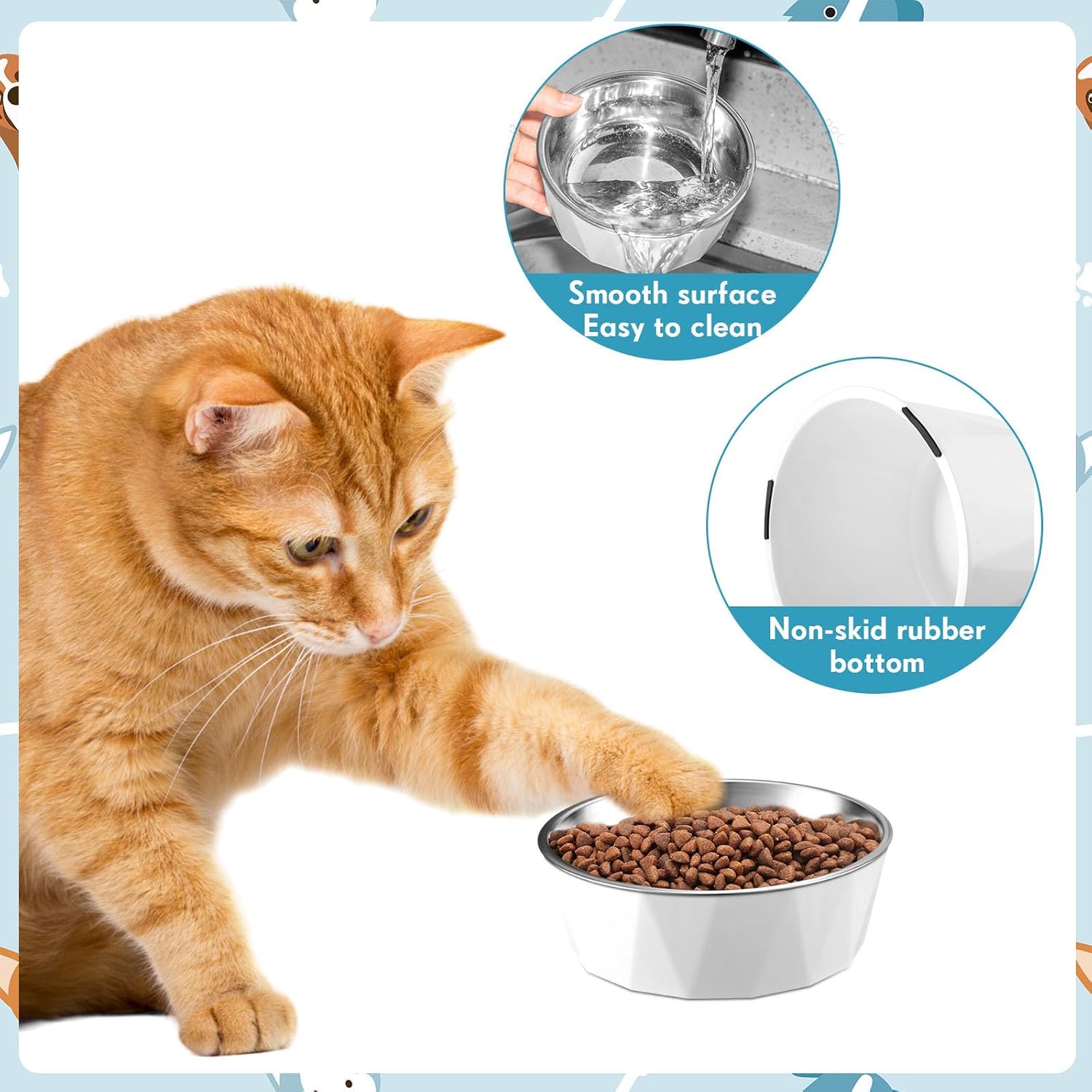 Non Slip and Stable: the bottom of this the elevated water bowl for cats is equipped with rubber anti slip pads, can not only prevent food from dripping or spilling when pets are eating, but keep the bowl in place without moving around or tipping over, giving your pets a pleasant eating and drinking time; The raised base is more hygienic and can reduce hair, dirt and dust deposits