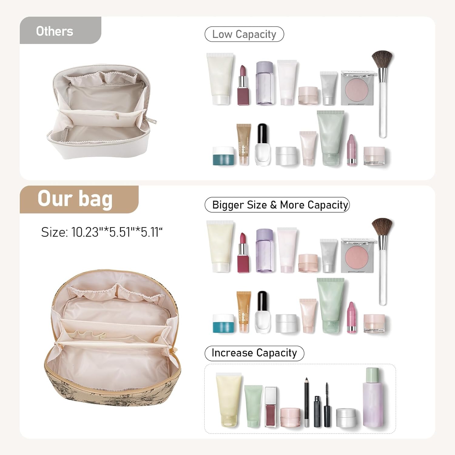 💗Large Capacity Cosmetic Bag For Women: with Upgrade size at 10.24″ *5.51″*5.11″ this makeup bag includes inner pockets and one external Brush area with zipper , providing organized storage for cosmetics and toiletries.