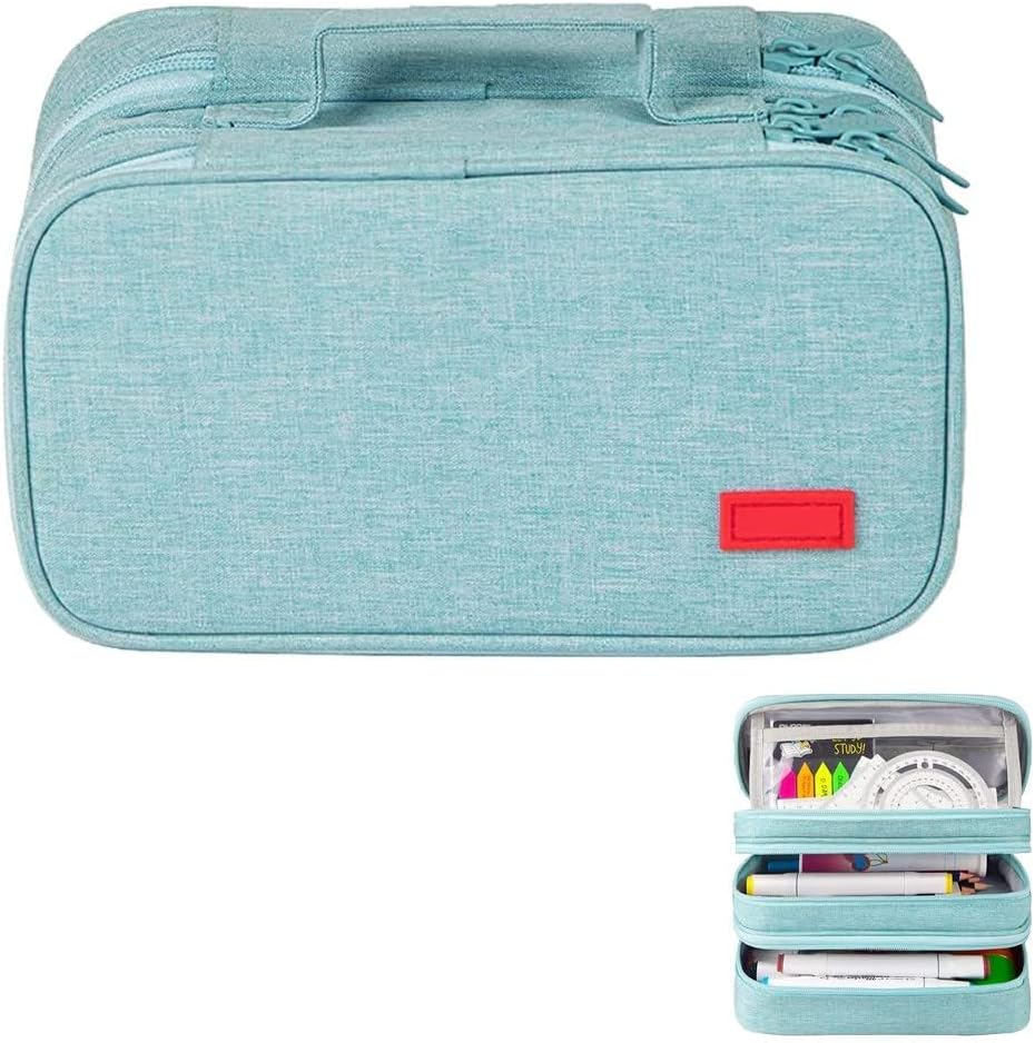 SYCYKA Large Capacity Pencil Case Pouch with 3 Compartments Portable Canvas Stationery Organizer with Double Zippers Simple Sturdy for College School Office Girl Boy Men Women Adult – Light Blue