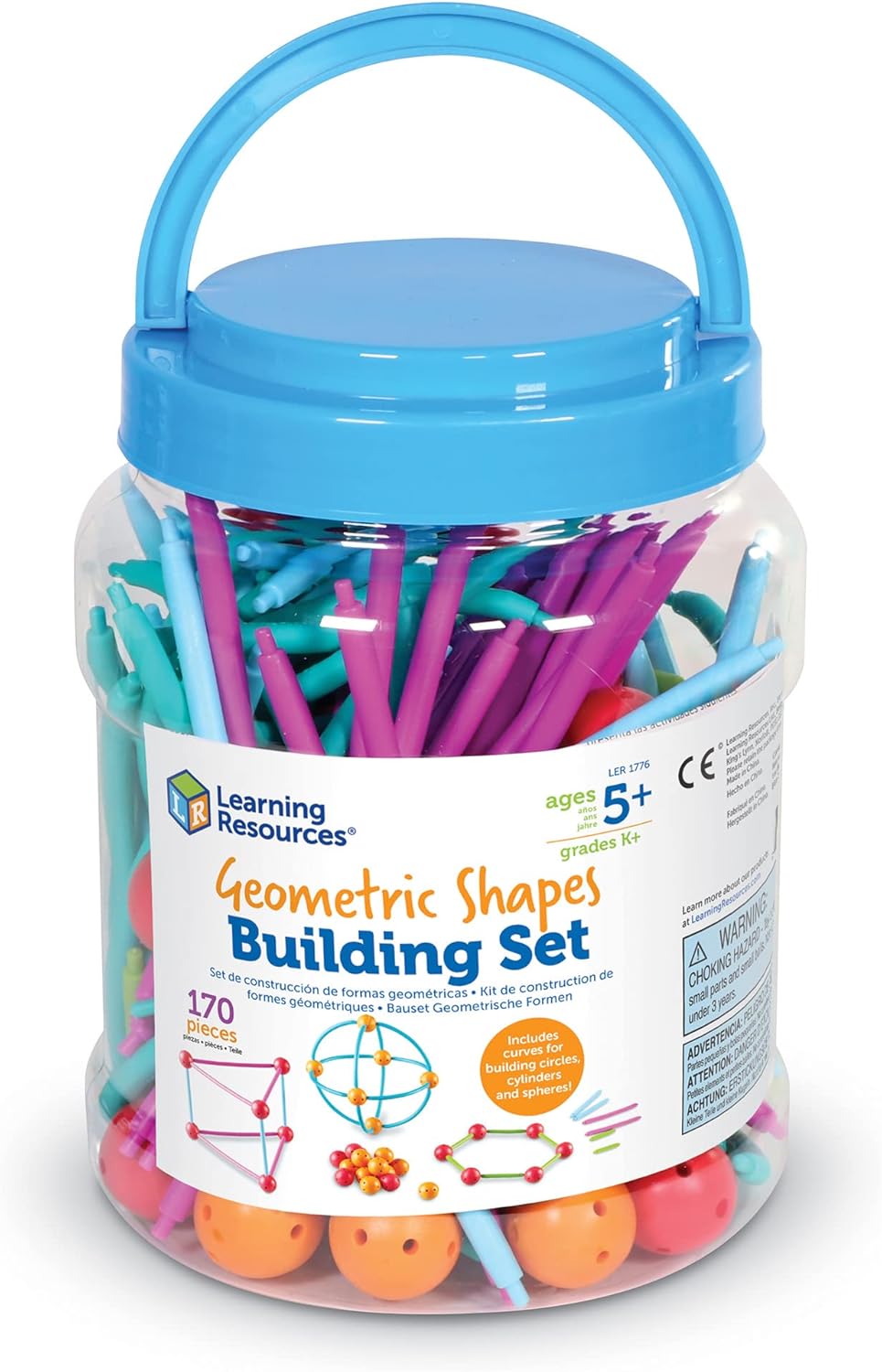 Geometric Shapes Building Set Create endless opportunities for students to build and explore shapes! Combine sticks in 3 sizes, along with curves for making circles and cylinders, with 2 different types of connecters to build 2-D shapes. Then, combine them to make new 2-D shapes, and even 3-D shapes! Child-friendly set features durable sticks, curves, and connectors. Includes 90 sticks in 3 sizes (21⁄2”, 33⁄4”, 51⁄2”), 32 curves, and 48 connectors (1′′ in diameter) and activities aligned to the Common Core.
